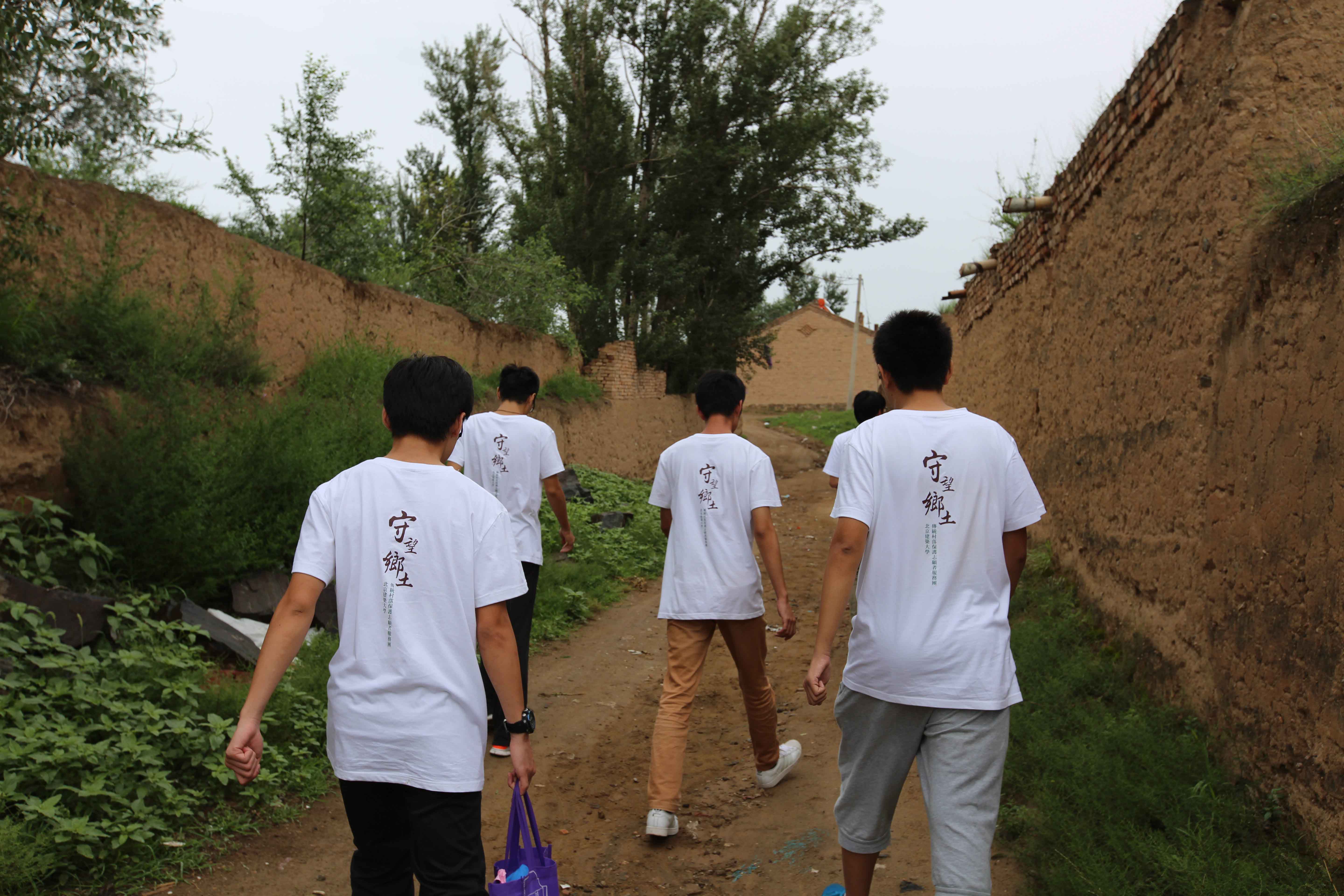因为当地村子多建在沟壑两侧,交通颇为不便,为志愿者的调研造成了很大不便,师生们冒着炎炎烈日穿梭在乡间小道上,地面土质坚硬,走在上面嘎吱作响,随处可见用黄黏土搭砌的院墙,废弃的窑屋起伏错落的展现在眼前,有的只剩下断壁残垣,却矗立不倒,金色的阳光照射在土墙上,将一排排碹窑点染得明暗有致,显现出一种残缺荒凉的美。