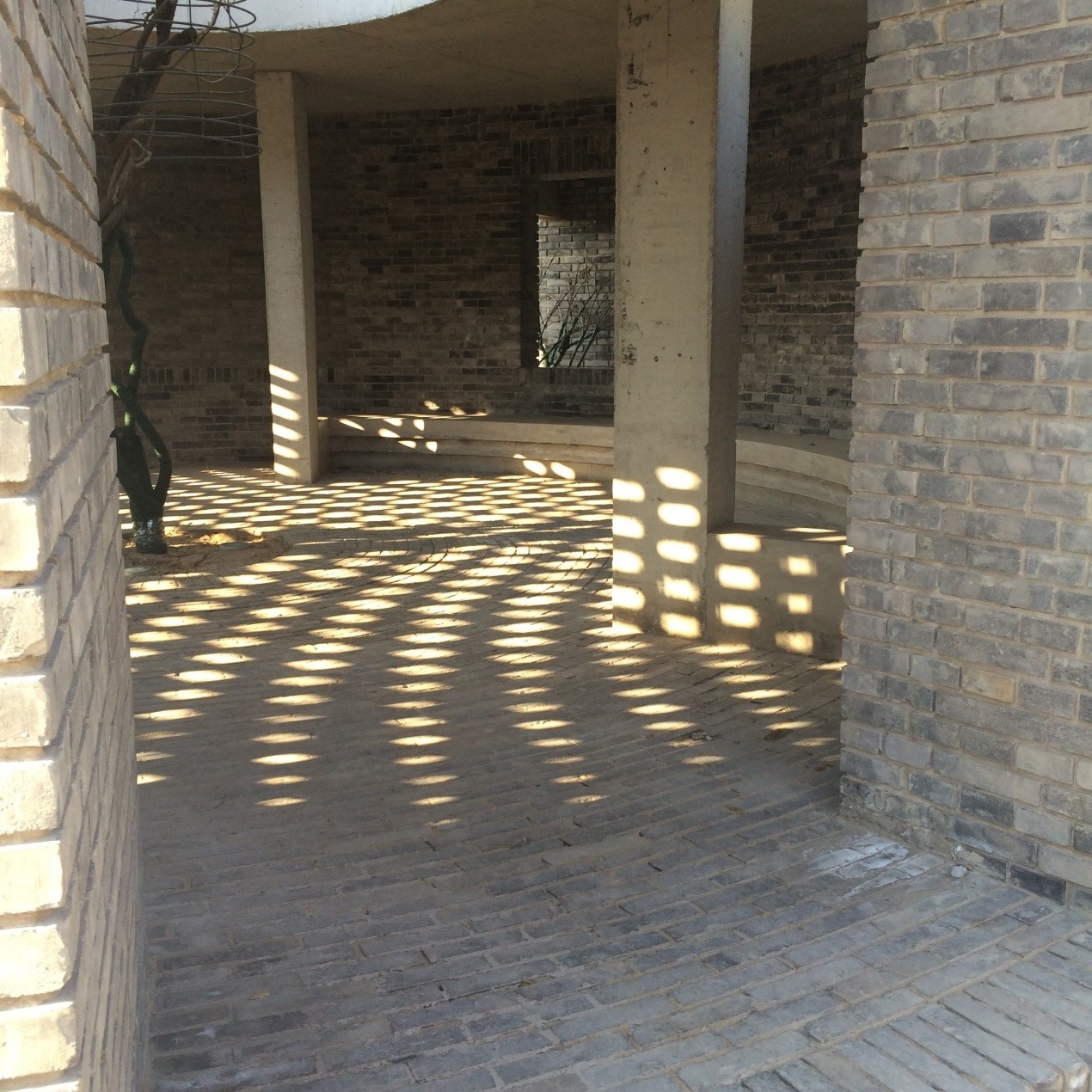兜兜转转中又到了室外,光亮注入眼中,似房屋后院,但又比那里要有趣许多。多处拱门,廊子也都用红砖砌成,渐渐生出震撼的感觉,也许这就是重复的力量,尽管它纯粹,朴素,但也让人体味到生活的五味。正是“一曲天然万古新,豪华落尽只真纯”当代山水庭院的园林式美术馆,植根于中国传统文化设计,大巧不工。而在园林中另有一处空间也是乐趣无穷,四面皆相同,如厚重石门半开,神秘,奥妙。处于其中,若不是有一段流水引路,认路绝对会成为一件难事。而在穿过石门时,都会不自觉放缓脚步,小心翼翼,出门即要转弯,则形成视线阻挡,对于未知,人们往往好奇有畏惧。走过石门又见一段拱廊,环环相套,明暗的交融,配上枯败的藤蔓,却在的脑海中想象出茂盛时节的模样。“花开花谢春不管,拂意事休对人言;水暖水寒鱼自知,会心处还期独赏”四季交替,只是走过这段廊子,但在人眼里它的故事还是同样。这段环廊好像是隐秘的空间,她像是一位老妇人,有阅历也还会孤芳自赏。另一特色是墙的小于九十度的转角,整齐的排列,或是突出或是缩进的设计让人眼前一亮。回家后我特地查阅了这种罗列的名字“阴作法”“阳作法”形象的表现了这种体现。