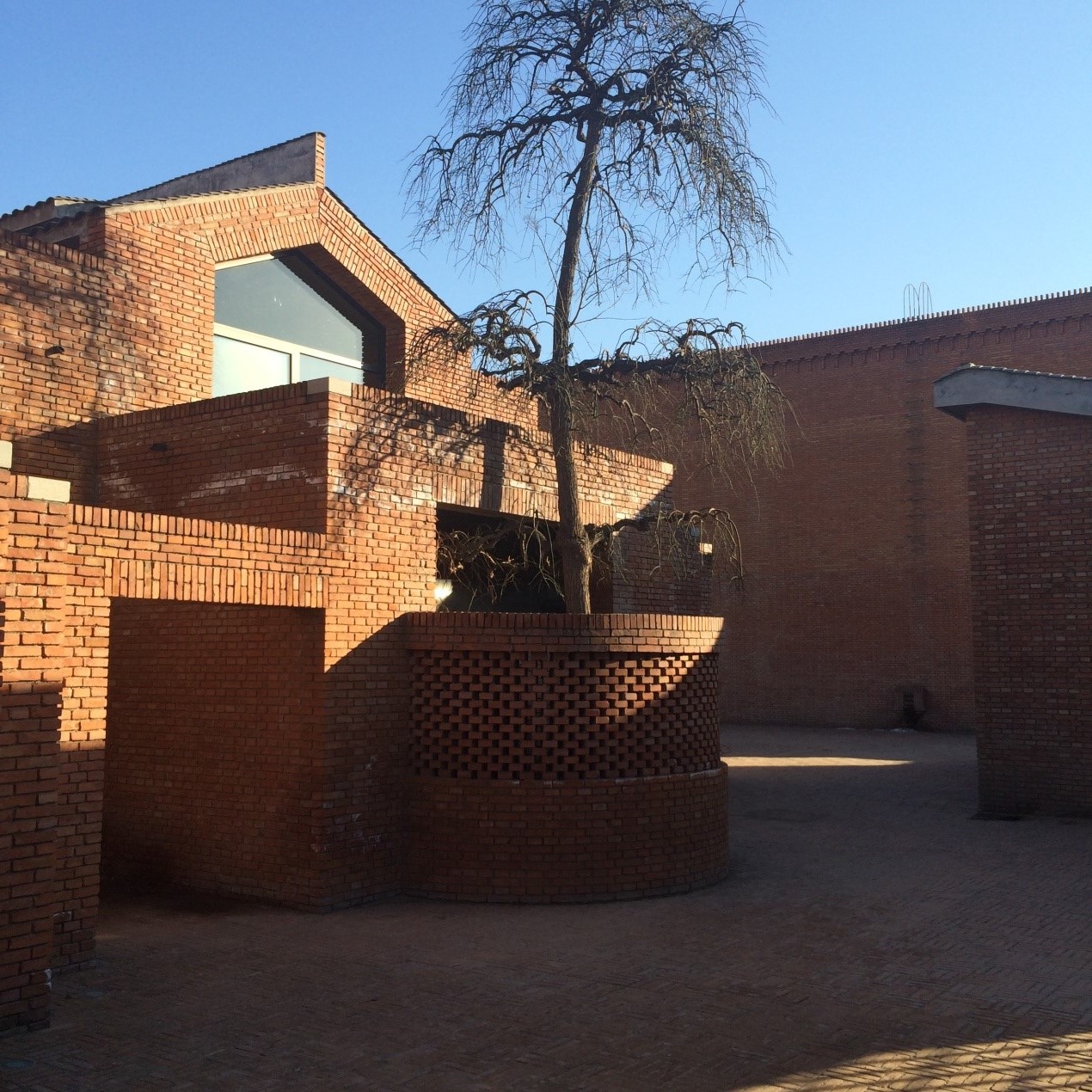 初到这里,并没有一眼找出红砖美术馆,他与周围环境完美契合在暗色调之中,来到美术馆旁,忽然感到赤色的砖块辉映在阳光之中的暖意。在美术馆外的桌椅围栏也是红砖筑成,周围由竹子围住,瞬时坠入有如陶渊明诗句般的意味之中。转身走向入口,入口采用圆的造型与方砖的规矩碰撞,别有一种柔情。正中的玻璃则与红砖材质间的强烈对比,加之室内弱光与室外强光相交杂,来者身形映在玻璃上,戏剧性地好似要走入画框,让人不禁自作多情一番,陡然进入较暗的室内不觉冷却下来,与气氛一同陷入一番深沉。大厅中央是一块下沉的圆形地段,圆心处立一根柱子,顶端用铁链悬着一段金属圆柱,随柱子的旋转的惯性而匀速飞旋,缓慢的速度让我想到了法院的公平,或许这就是如计时器般让我感到一丝无力。尽管那么慢慢的却一直在流逝,没有人知道怎么将它停下。其中四通八达,各个方向都有展厅,通往其他展厅的走廊让我记忆深刻的是一处由纯白渲染的空间与红砖的丰富转化,白色十分干净,眼球受到冲击之感,又好像喝茶之余的一口淡奶油,明亮闯入心房,加以佐味。
