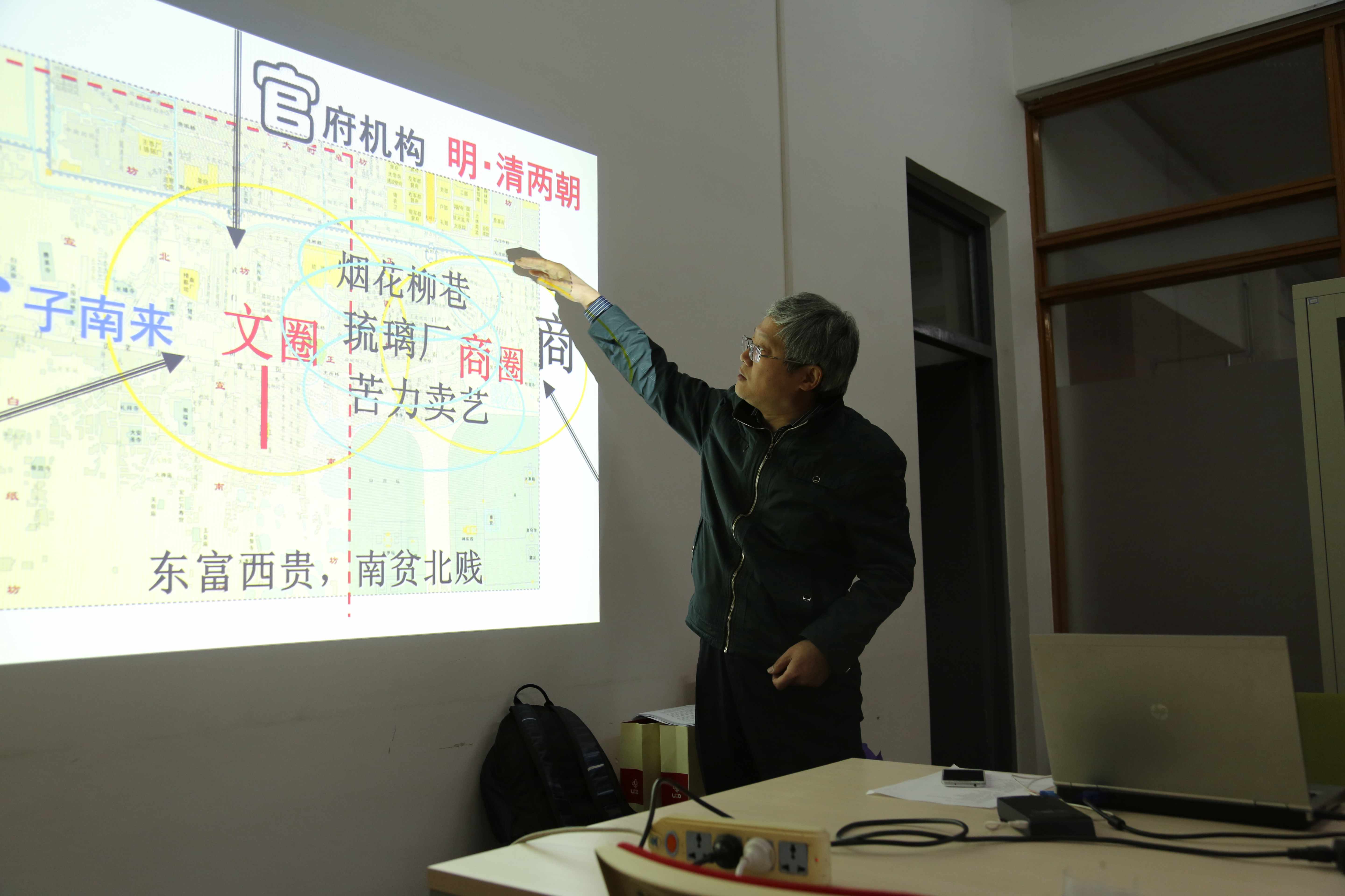 王馆长首先从“北京的印象”讲起,为方便同学们理解,王馆长向同学们推荐三篇针对北京建筑的调查文章,并逐一进行讲解。接下来,王馆长以自己从小长大的地方——“丞相胡同与菜市口”为题开始了此次讲座。讲座分为三部分,以自己研究成果为例讲解整理内容、调查方面、故事记录及摄影技巧。其中调查包括历史、背景、事件及人物等要素。王馆长以风趣的语言讲述了自己的调研过程,告诉同学实地考察时要了解地图、街区、地质水文。并以街区调查为例,表示尺寸、名迹、文化同样重要。对实地操作讲解时,列出要提前找好资料,设计记录路线,对于故事记录者要善于与当地人交流,以便找到最具价值的景观、历史遗存。摄像人员则要找好拍摄角度,全局正面近景面面俱到,让观者读取更多视觉信息。
