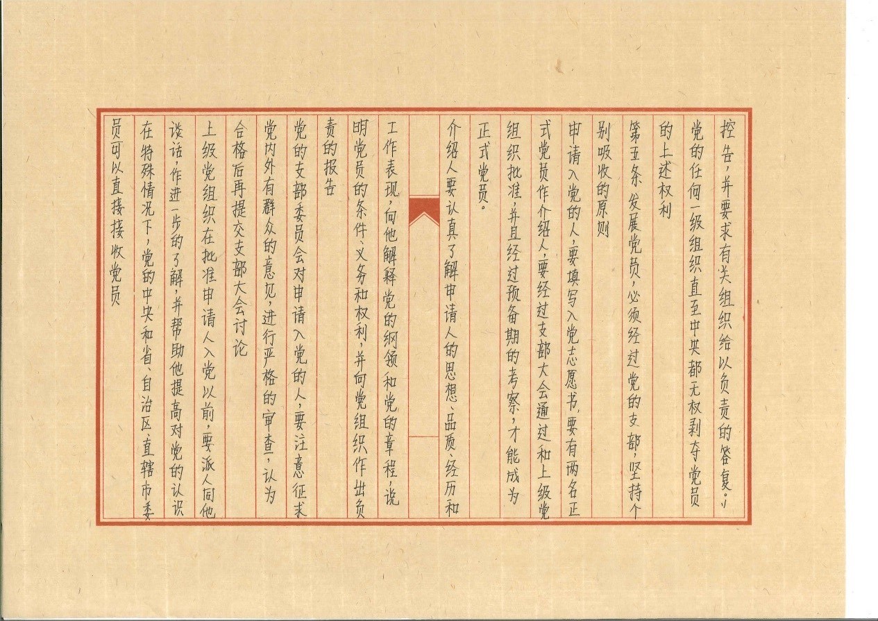 公司党员理论学习与实践活动,一贯秉承将专业特色融入党建活动中的思路,让员工党员以专业为带动,调动员工党员参加组织生活的积极性,激发广大党员同学学理论、用理论的热情,本次党章学习活动主要以员工党员抄写党章的形式展开,以员工党支部为单位,协调各支部党员人数,每名员工党员进行600字左右的党章抄写,形式以专业学习中的工程字、软笔字为主。该项活动历时三周,员工党员挑选出较为整齐美观的手抄党章,在支部内进行交流学习,并最终挑选部分作品装订成册,在公司内进行交流展示。