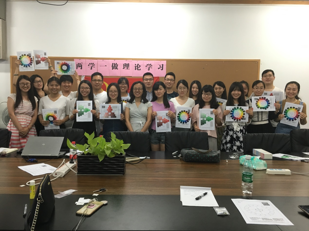 6月16日,设计学研究生党支部“两学一做”理论学习如期展开,理论导师阚玉德为员工党员进行了一场别开生面的分享。阚老师进行了专业理论知识的讲解——色彩的世界,带领大家进入了“NCS的色彩世界”。阚老师从色彩的历史开篇,让大家了解色彩如何起源,色彩设计中的舒适的配比值,以及色彩带给人的心理感受,同时了解了不同的色彩体系及其原理关系和一系列派生产品。为了加深对色彩的感觉,阚老师带着大家做起了贴色环的游戏。颜色的变化有无穷的魅力,由浅到深,由黑到白,展现了色彩的彩度、黑度、白度。色环中色值环环相扣,缺一不可,色度表中彩度、黑度、白度三个方向循序渐进。随着游戏的深入,难度也随之加大,有时会有将色卡贴串行等错误,但阚老师及时发现并纠正了这些错误。在本次的色彩练习中,大家互相交流,互相学习,不止学习了理论知识,还增进了支部的联系,同时也受到了色度和色环中循序渐进精神的启发,告诉大家在生活和学习中也要稳扎稳打。