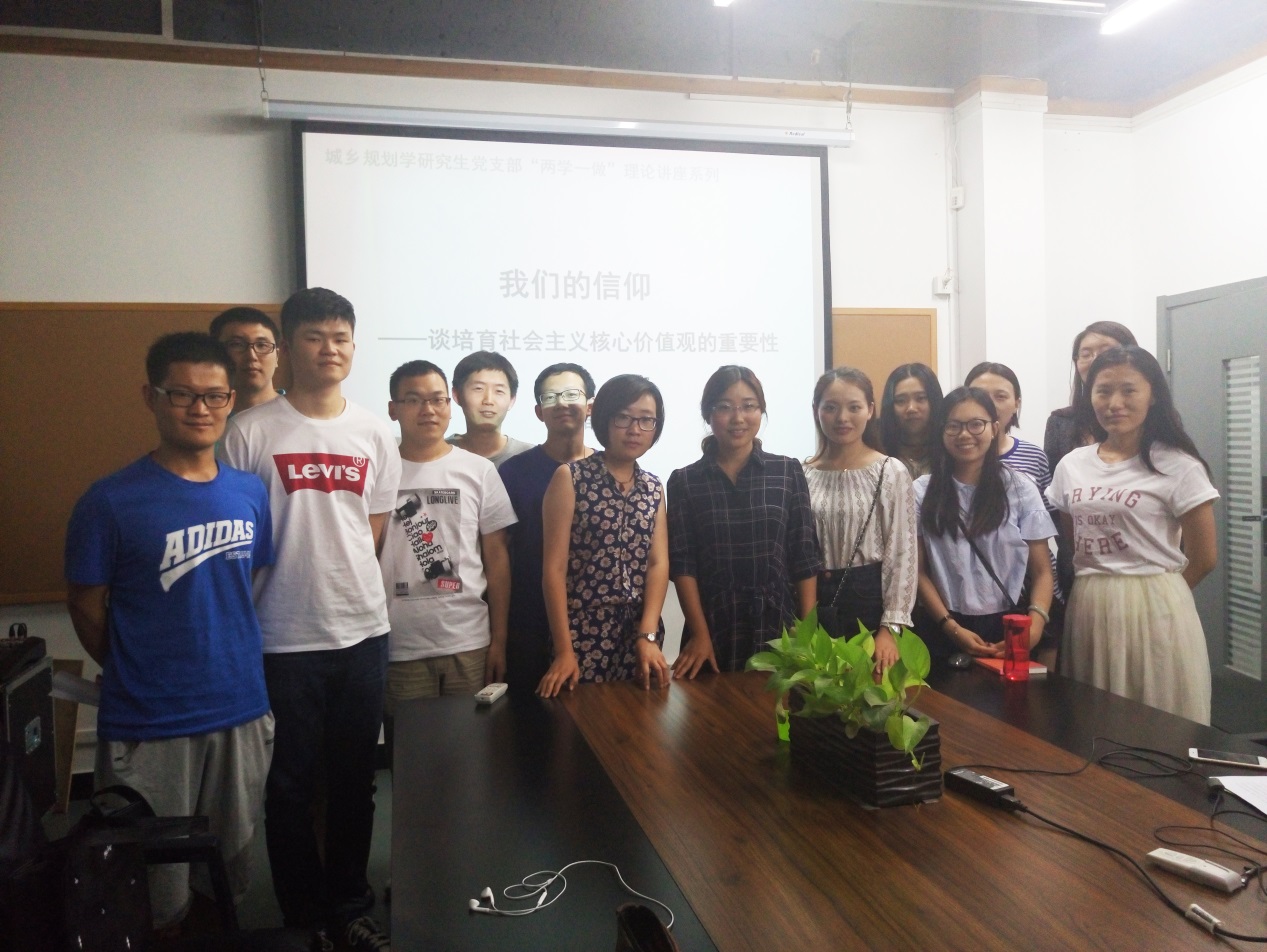 为深入学习贯彻习近平总书记系列重要讲话精神,6月6日城乡规划学研究生支部组织开展了“两学一做”系列理论学习交流会。邀请理论导师王晶开展理论学习,围绕“我们的信仰——培育社会主义核心价值关”主题,展开了风趣幽默的学习交流。开展“两学一做”学习教育,基础在学,关键在做。要把党的思想建设放在首位就意味着树立正确的价值观具有很重要的意义,培育社会主义核心价值观就是要端正和巩固党员的思想。此次交流与以往不同,一改理论导师讲课模式的传统,在导师传达理论精神的同时,具有很强的互动性。同学们都能积极主动的思考、交流、讨论,会后支部成员纷纷反映此次理论交流既充满趣味性,又能将社会主义核心价值观深入人心。
