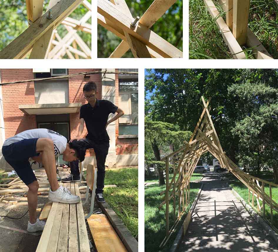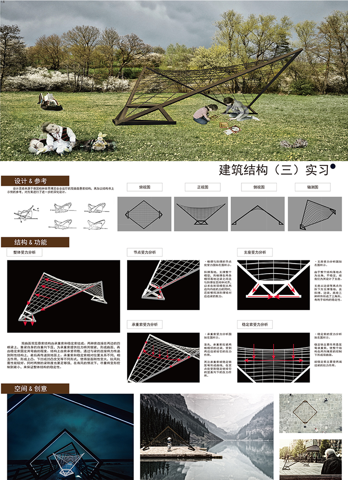 设计灵感来源于悬索大桥,但由于拱形桥的形式国语单一,使用木条组成木桁架结构较为简单,进行简单的方案深化之后,将完整的拱变成了单侧的悬臂结构,同时为平衡倾覆力并使造型美观,又设计了倾斜的拱,并且通过底座连接和绳子的联系使两边各自达到平衡。