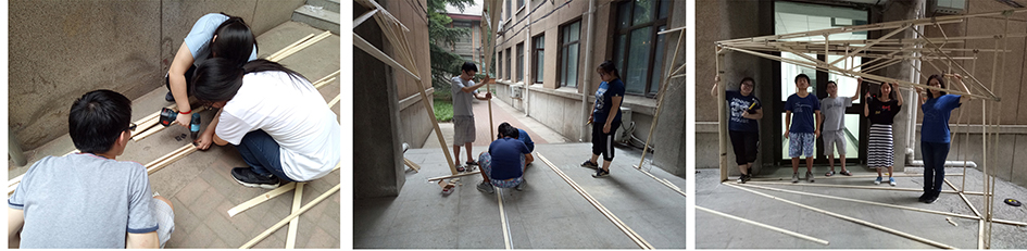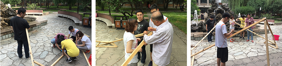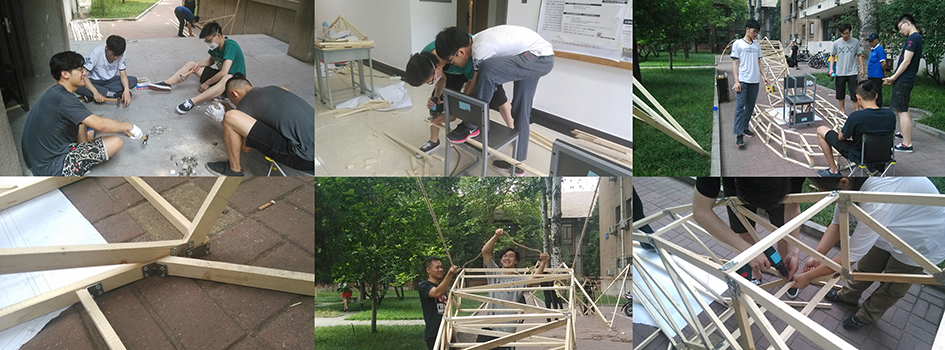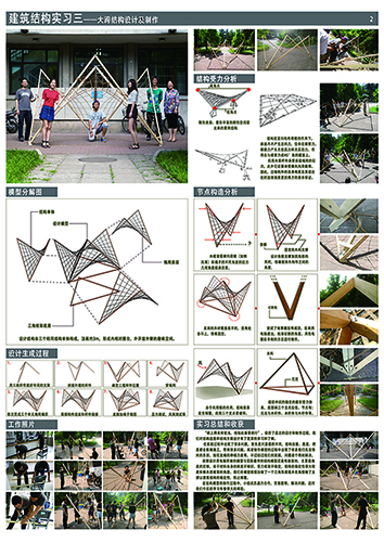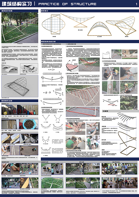 本次大三建筑结构(三)实习周的课题是组合建筑结构选型,以“杆、曲面、组合结构”为设计题目。意在使同学们运用建筑结构体系的相关知识,设计制作结构概念模型,体会和掌握结构形态、结构体的强度、刚度、稳定性和整体性特征,体会结构构件和构件连接的规律和要求。设计内容为高耸或大跨结构体系,要求根据自行选定的材料,设计并制作具有一定空间形态的、具有抵抗变形、抵抗倾覆、能承受一定重量的模型,要求模型以杆为组件,连接方法不限。