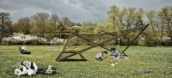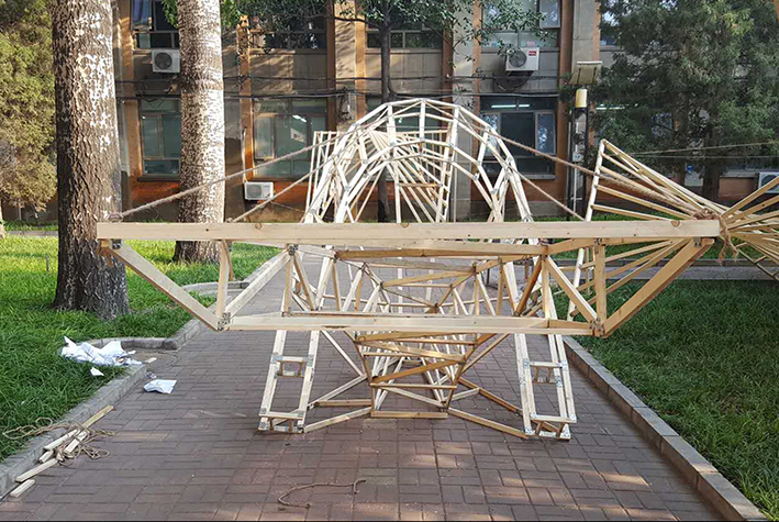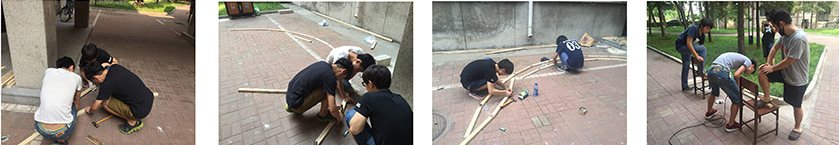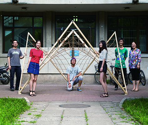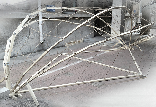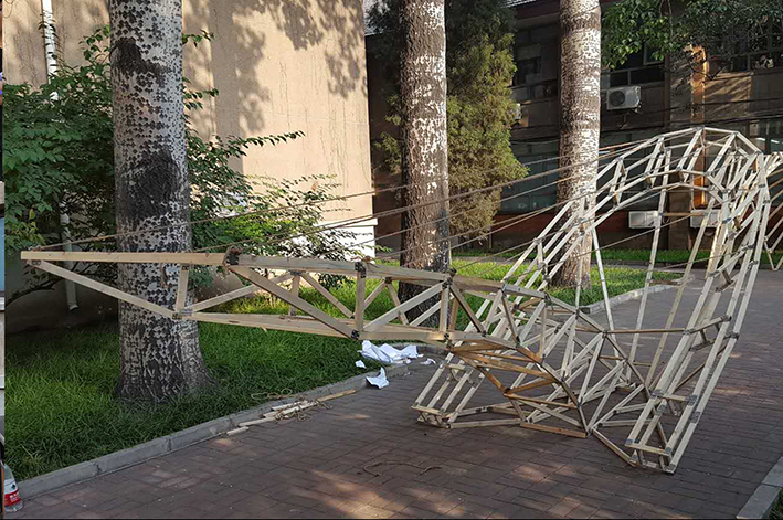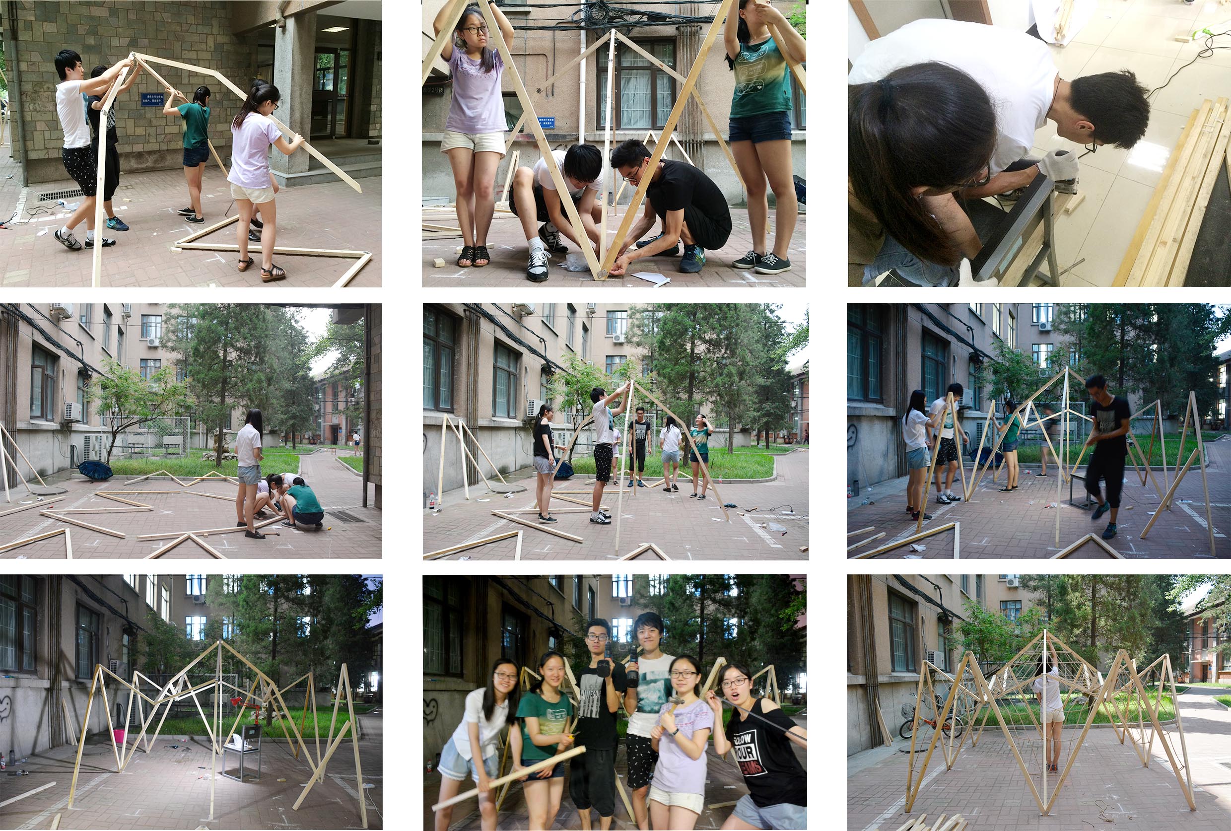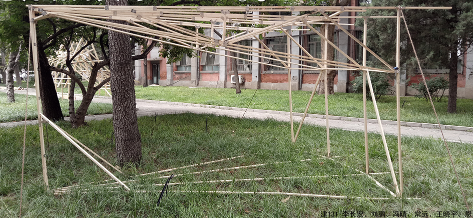 此次结构模型设计灵感来源于国际教养大学图书馆。设计模型为桁架结构,由四部分相同的单体组成,单体由一点链接,各自之间的角度是10度的扇形平面。在制作完模型的设计部分之后,在地面投影位置制作了底座和里面斜撑加以固定。最后将模型放置到草地中,四角引出绳索链接至木桩中,进一步加固,提高模型整体完整性。