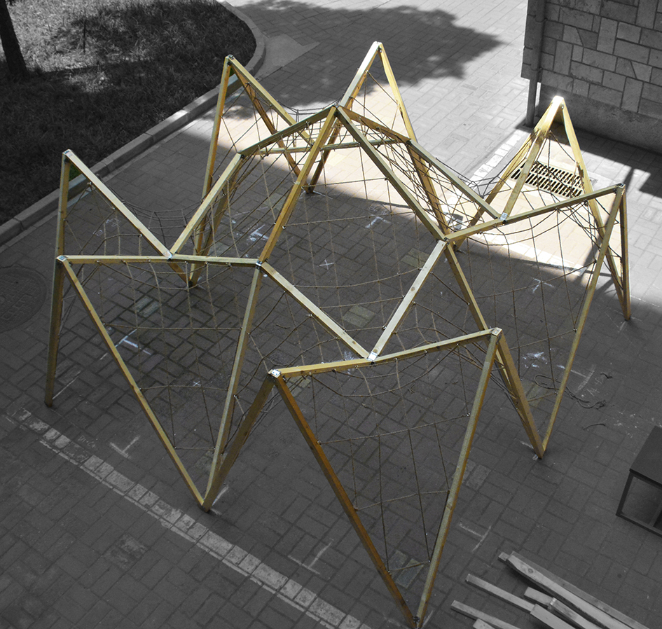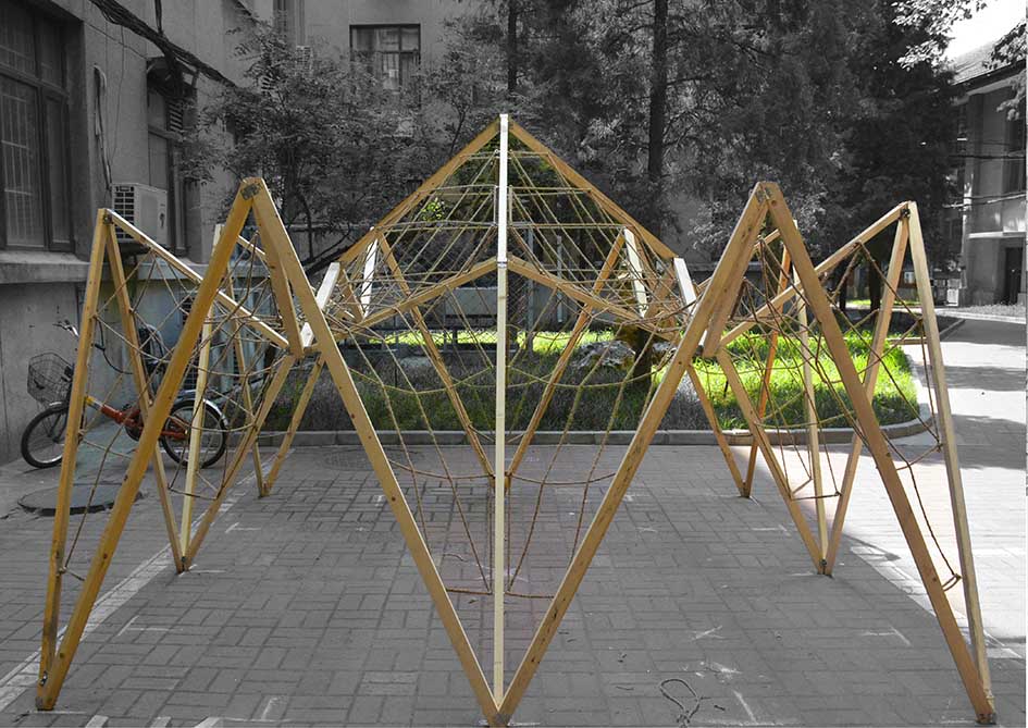 经过多轮讨论,决定选择双曲抛物面壳结构,运用木杆件和绳索两种主要材料进行建构,营造独特的薄壁结构形式。以一个单元为出发点,形成围合感强烈由能满足功能要求的空间。综合考虑整体刚度要求,确定最高点2米,跨度4.2米;采用相应构造措施,依靠自身刚度有效抵抗扭壳推力。