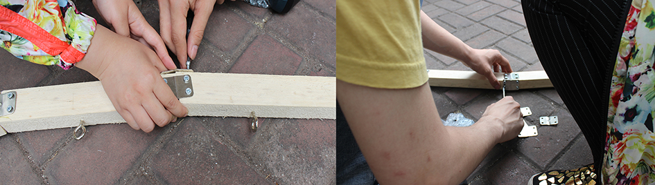 以木条作为模型制作的主要材料,节点的固定则使用直角铁和钉子进行固定,两个结构之间用麻绳进行连接。