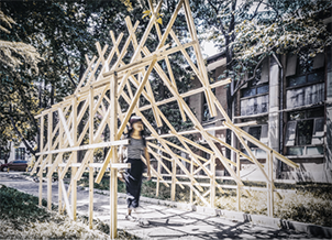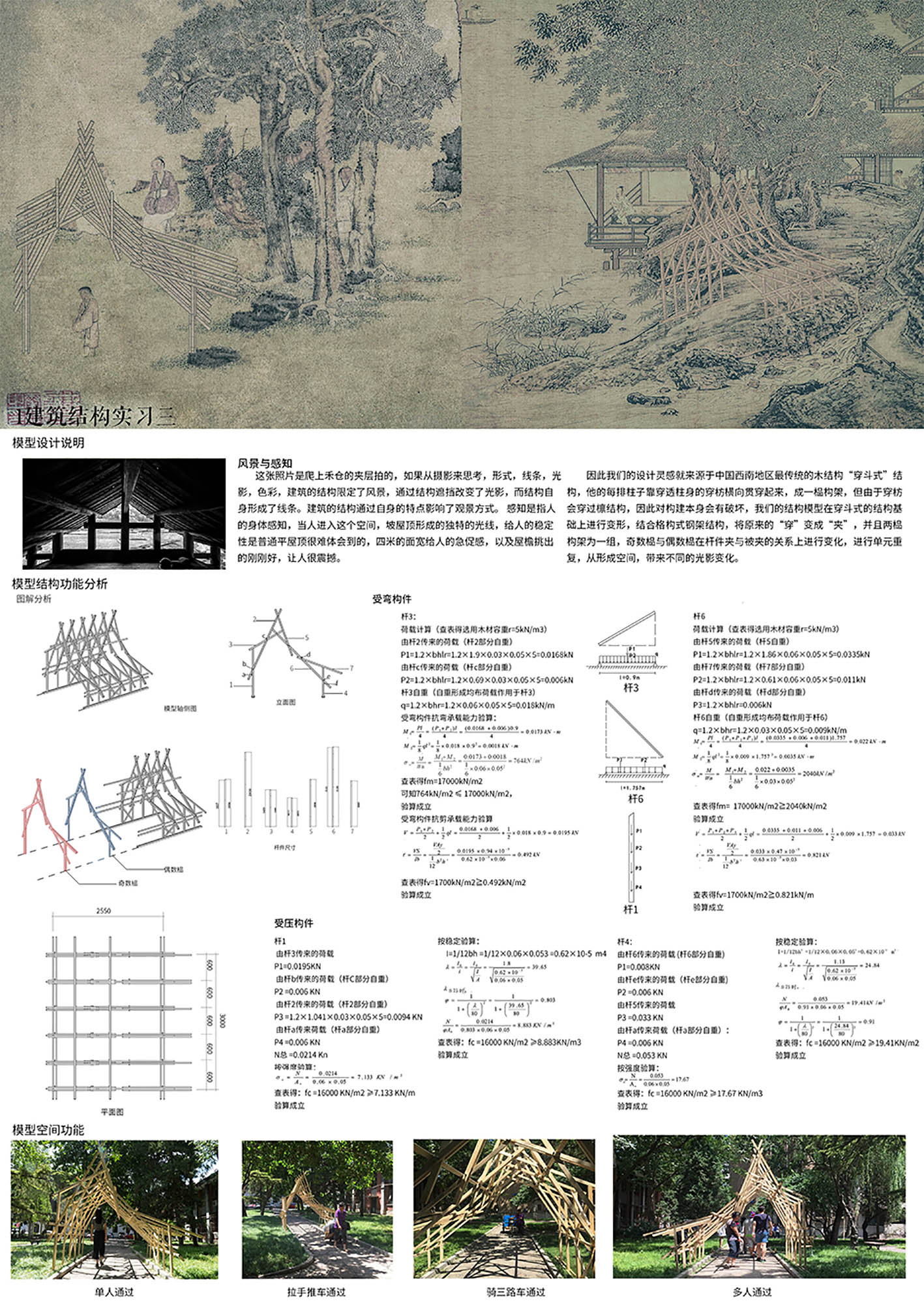 我们的设计灵感来源于中国西南地区最传统的木结构“穿斗式”结构,他的每排柱子靠穿透柱身的穿枋横向贯穿起来,成一榀构架,但由于穿枋会穿过檩结构,因此对构建本身会有破坏,我们的结构模型在穿斗式的结构基础上进行变形,结合格构式钢架结构,将原来的“穿”变成“夹”,并且两榀构架为一组,奇数榀与偶数榀在杆件夹与被夹的关系上进行变化,进行单元重复,从形成空间,带来不同的光影变化。通过结构形成框景限定人的视线,形成通道供人穿越。