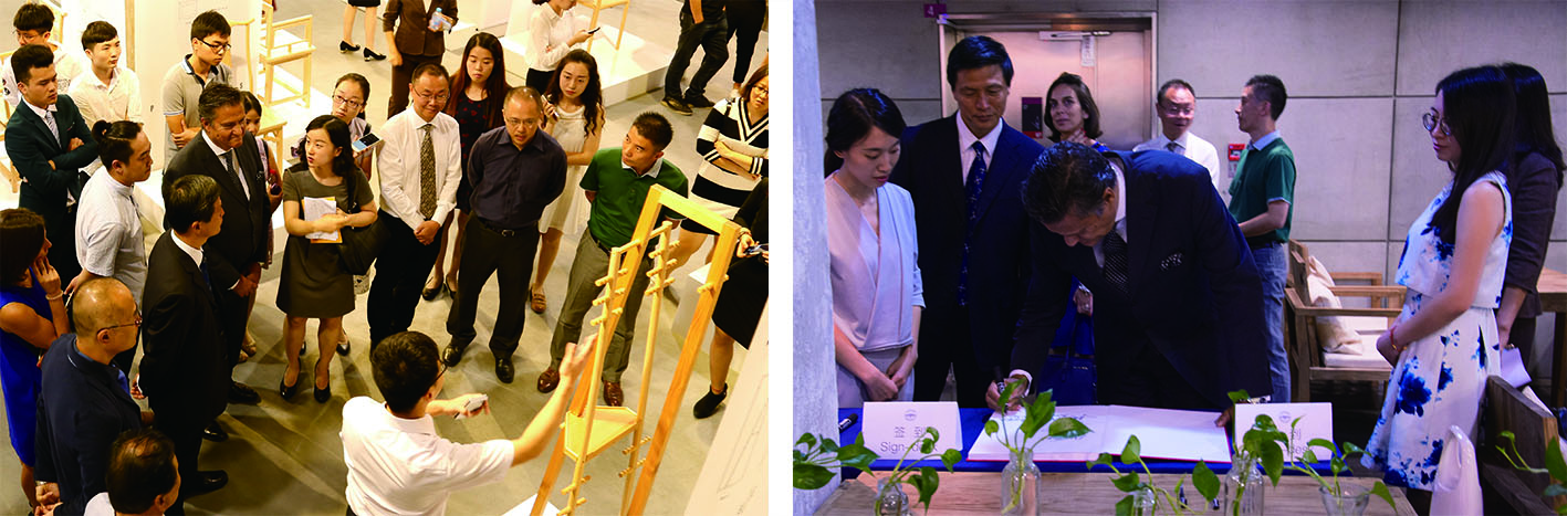 展览开幕式结束后,与会人员共同参观了展览。领导、嘉宾欣然在yl7703永利关于传统家具技艺、传统木雕技艺学术出版物上赠言题字,与作品设计师生进行了交流和探讨。