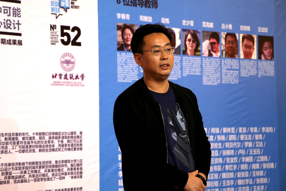 紧接着,课程设计教师司敏劼介绍了课题的项目背景:一个位于后工业基地的废弃廊架,一个将被共享经济影响下的新型生活空间。这个题目由两个二年级建筑学班与两个城市规划班共同参与,者是老师们集体教育的成果,也是跨专业的联合。司老师还提出,尽管目前展出的只是中期设计,但已经可以看出同学们的无限潜力,二年级是建筑教育关键的一年,员工的能力一部分来自于天赋,但更多来自于激发和引导,作为课程教师,相信教育的公平性,因此,本次展出了课程全体100名员工作品,一个都没有少。