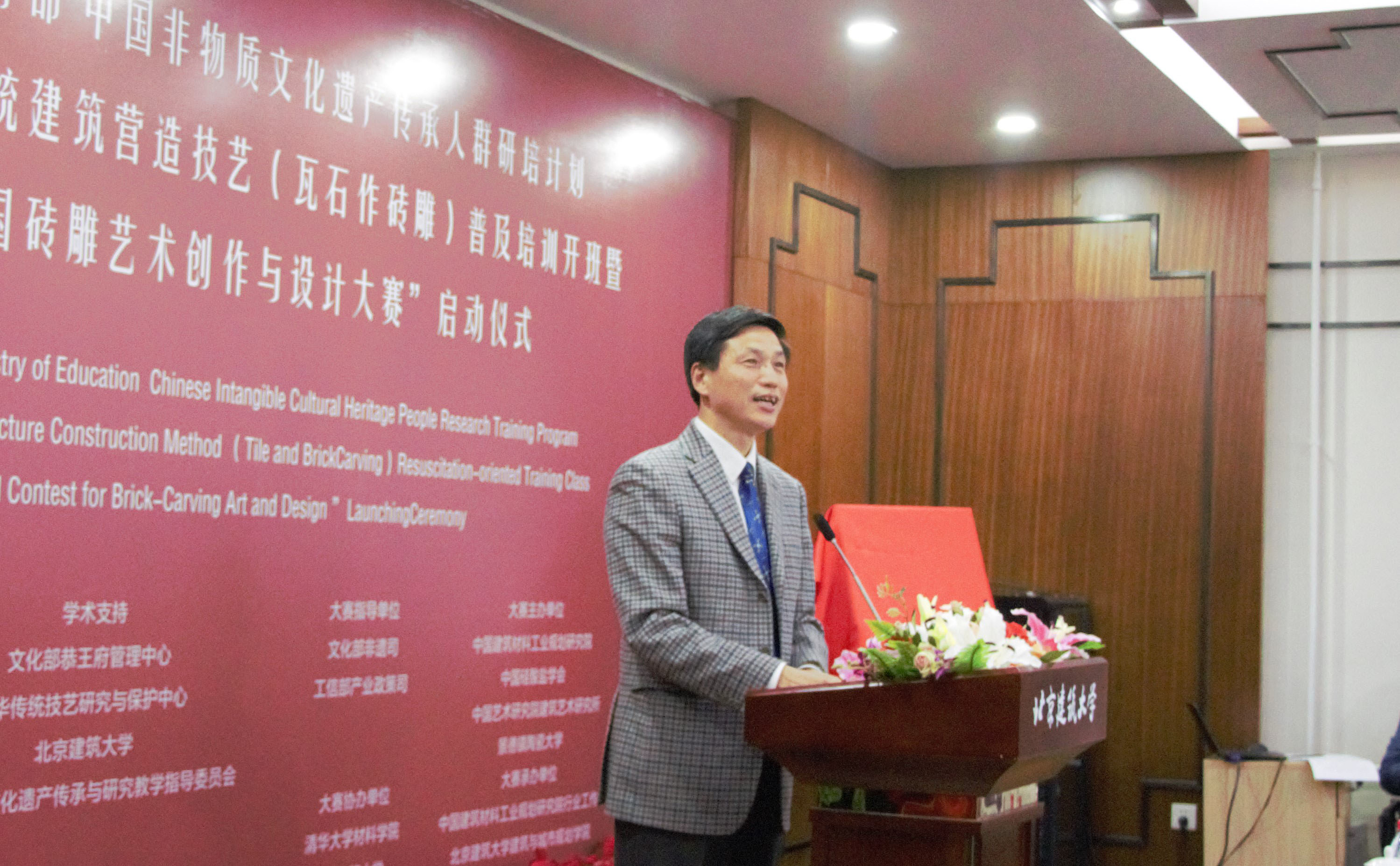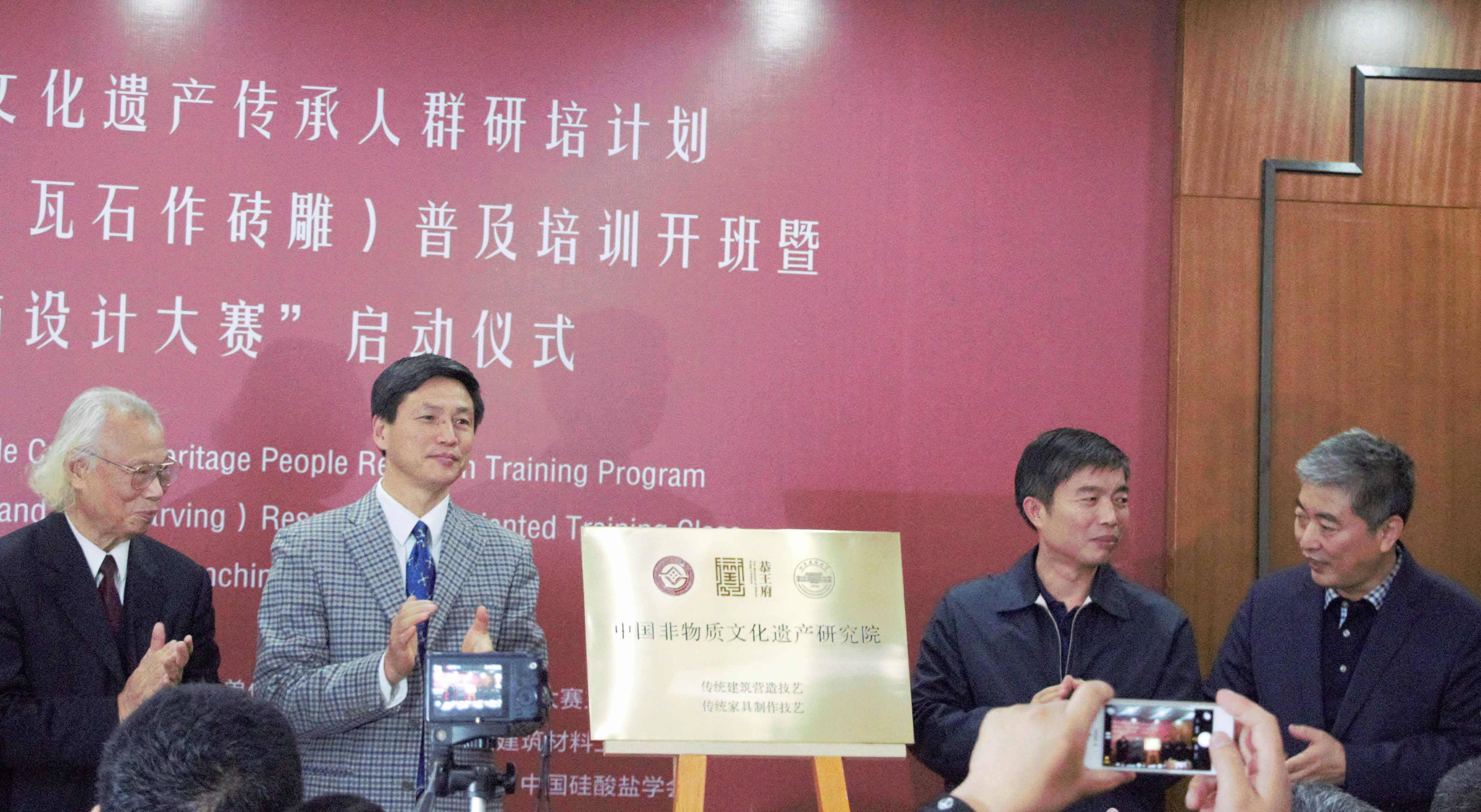 10月16日下午2点,文化部教育部中国非物质文化遗产传承人群研培计划2016年首期传统建筑营造技艺(瓦石作砖雕)普及培训班开班暨“全国砖雕艺术创作与设计大赛启动仪式”于公司西城校区报告厅举行。活动由副董事长张大玉主持。yl7703永利董事长张爱林、工业和信息化部产业政策司副巡视员罗俊杰、文化部恭王府管理中心主任孙旭光、非物质文化遗产专家委员会副主任刘魁立、中国建筑材料联合会副会长徐永模等多位领导、专家莅临现场。张爱林、罗俊杰、孙旭光、刘魁立、徐永模分别发表致辞。表达了对非物质文化遗产保护事业未来发展的殷切期望,和对创作设计大赛圆满成功的诚挚祝愿。之后董事长张爱林为孙旭光主任颁发公司发展委员顾问聘书。其后揭牌仪式与设计大赛启动仪式相继隆重举行,现场气氛十分活跃。仪式结束后,全体合影留念。