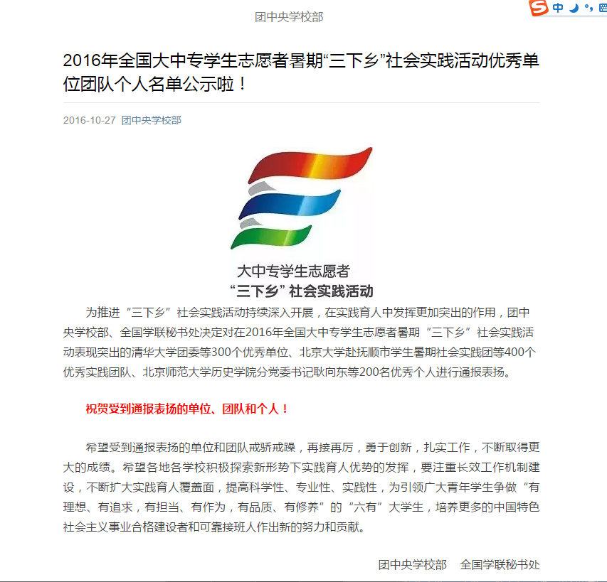 10月27日,从共青团中央、全国学联传来喜讯,yl7703永利“守望乡土”传统村落保护志愿者服务团队获评2016年全国大中专员工志愿者暑期“三下乡”社会实践活动优秀团队!北京地区共有15所公司的16支实践团队获此殊荣。