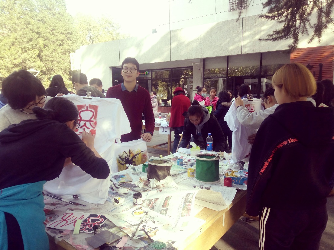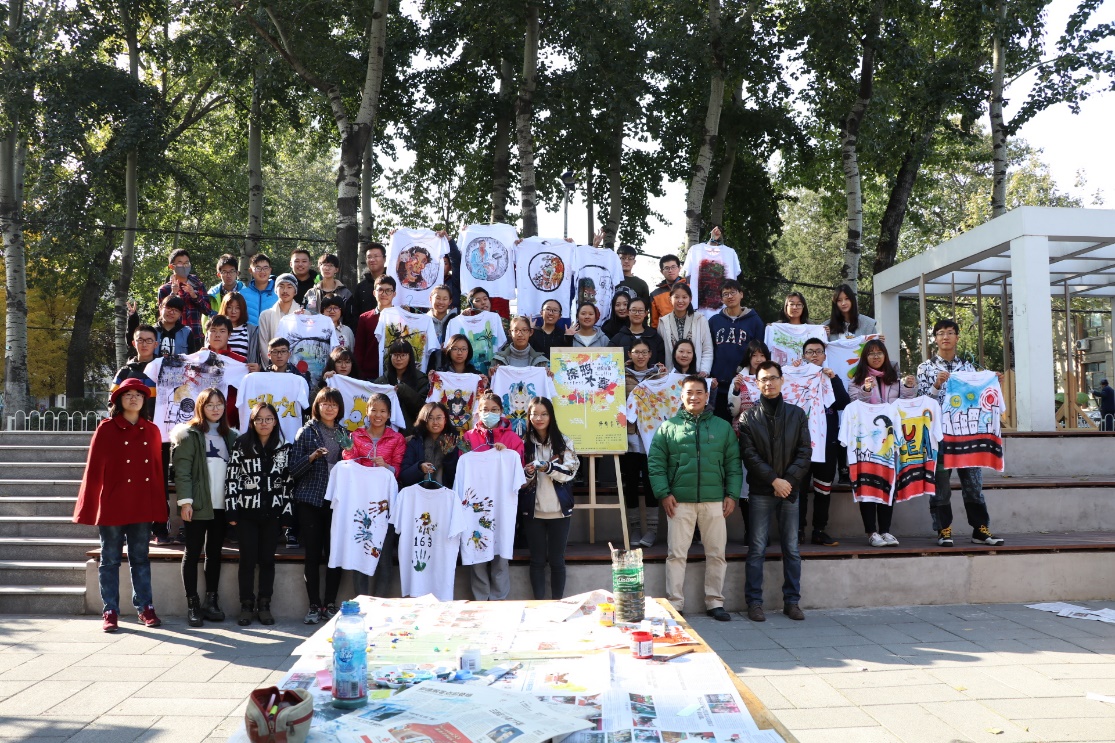 活动结束,大家纷纷与自己的作品合影留念,有的组还将衣服悬挂在场地旁边的树枝上,随风飘动的手绘T恤,集合着校园各处建筑景观的手绘T恤,成了校园里亮丽的风景线。