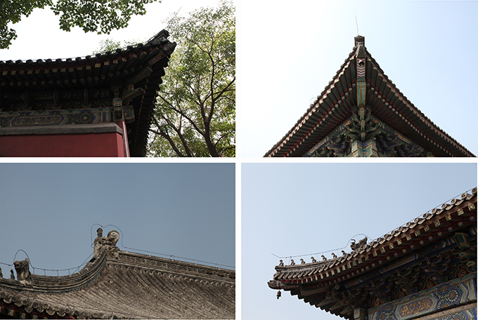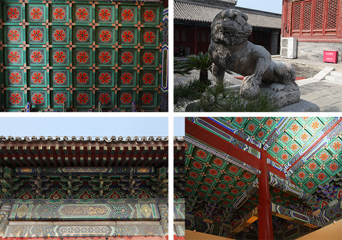 建筑的内外檐及天花均饰有外檐彩画为金线大点金龙锦方心旋子彩画,当心间和次间的大额枋的龙锦枋心旋子彩画的找头部分为勾丝咬,小额枋以及稍间额枋均为一整两破的找头。当心间和稍间的盒子为西番莲和坐龙,稍间没有盒子。由额垫板为宝珠吉祥草彩画,灶火门部分的油饰为三宝珠,整个外檐彩画庄重典雅,体现着佛教圣地的庄严威容。