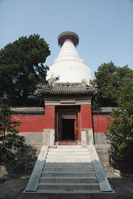 北京妙应寺白塔为中国现存最古之瓶形喇嘛塔,这座雄浑高耸的白色喇嘛塔是崇信佛法的元世祖忽必烈定都于大都后,为了供奉释迦佛舍利,特聘尼泊尔工艺匠师阿尼哥于辽塔旧迹上修建的,至元十六年落成后,才在巍峨白塔前建了一座规模宏大的寺院,称“大圣寿万安寺”,于明代天顺元年得以重建后改为“妙应寺”。妙应寺白塔迄至于今几经毁坏、重建,历经历史的巨大变迁,其辉煌与坎坷并存的经历使其承载着不同的历史信息,也对后世筑造喇嘛塔产生了深远的影响,从清朝修建的北海白塔中就能找寻到它的影子。西路现存部分院落,最南端为一座一殿一卷式垂花门,额枋绘苏式彩画,其下有板门两扇,板门后有屏门四扇。垂花门东西两侧有四棚游廊可通东西配殿。院内正殿三间为大觉能仁殿,硬山顶调大脊,筒瓦餍而,前出廊,额枋绘墨线小点金旋子彩画,正立面明间、次间装修均为五抹三交六碗桶扇门四扇,背立面装修明间为五抹三交六碗桶扇门四扇,次间为三抹三交六碗槛窗四扇。院内东西配殿各三间,链山顶调大脊,简瓦屋面,前出廊,额枋绘墨线小点金旋子彩画,明间装修为五抹三交六碗桶扇门四扇,次间为支摘窗。正殿东西两侧有游廊与过厅相连。过厅面阔七间,进深六檩,硬山卷棚顶,筒瓦屋面,前出廊。明间前出抱厦一间,悬山卷棚顶,简瓦屋面,抱厦及前廊带倒挂楣子,花牙子,坐凳楣子,额枋绘墨线小点金旋子彩画,明间装修为五抹三交六碗桶扇门四扇,次间、梢间、尽间为支摘窗。过厅后为藏经阁,坐北朝南,两层,面阔九间,呈“同”形(北侧五间,东西各两间),硬山顶调大脊,筒瓦屋面,前出廊。藏经阁二层额枋绘墨线小点金旋子彩画,廊步装饰有雀替及栏板,一层檐下装饰有挂檐板,廊步装饰有雀替及坐凳楣子。藏经阁北侧有小院一座,院内北房及南房各三间,硬山顶,简瓦屋面,装修为后改。