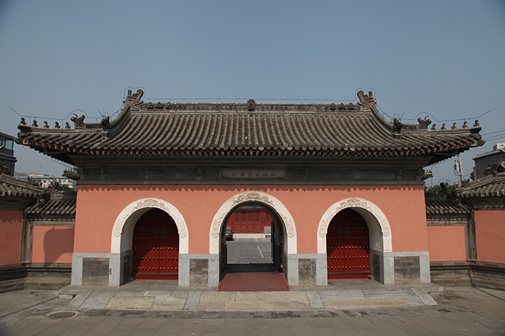 这座藏传佛格鲁派寺院,始建于元朝,初名“大圣寿万安寺”,寺内建于元朝的白塔是中国现存年代最早、规模最大的喇嘛塔。妙应寺坐北朝南,现存中、西两路。中路共四进院落,山门为现代复健,两阔三间,进深一间,为砖砌仿木结构建筑,歇山顶,筒瓦屋面。山门明间、此件开券门三座,明间券门上有石质匾额一方,刻“敕次妙应禅林”。山门两侧有八字影壁。山门东西两侧各有倒座房一座。