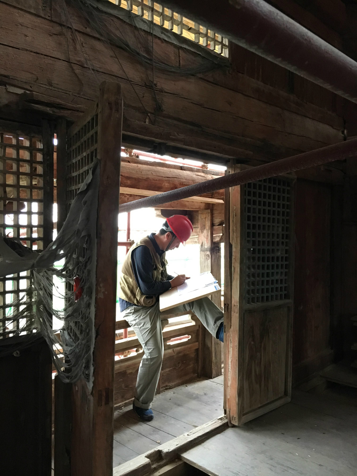 (王剑在玉皇阁二层回廊绘制斗拱大样)