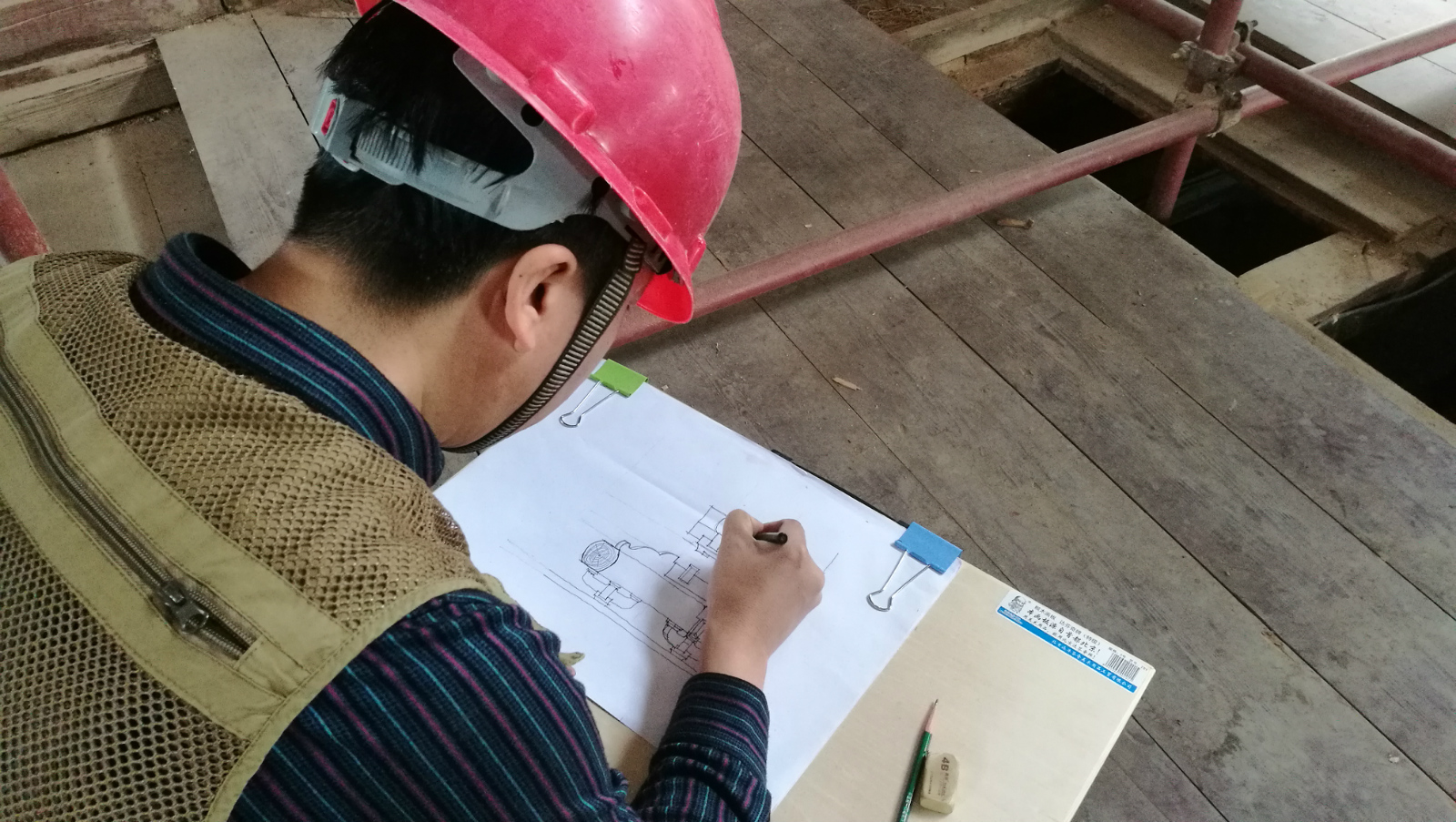 王老师对我们每个成员的分工是建立在丰富的实际工作经验基础之上。绘图过程中,遇到不明白的,数据未测量到的,都可以及时上现场观察和补测数据。这样,避免了后续撰写方案中无法补救的情况。