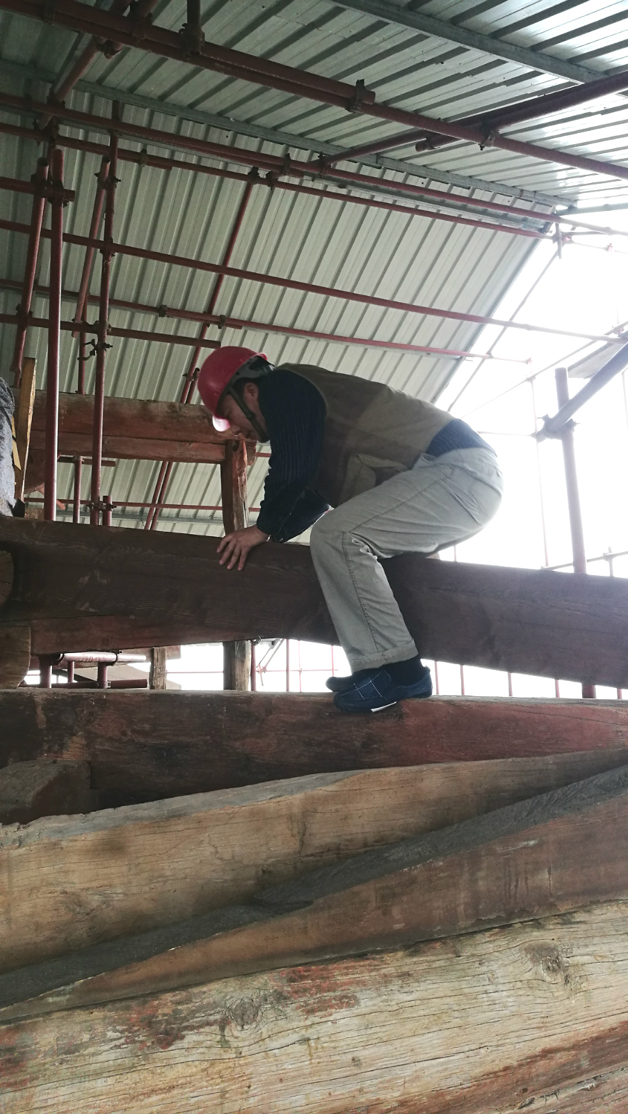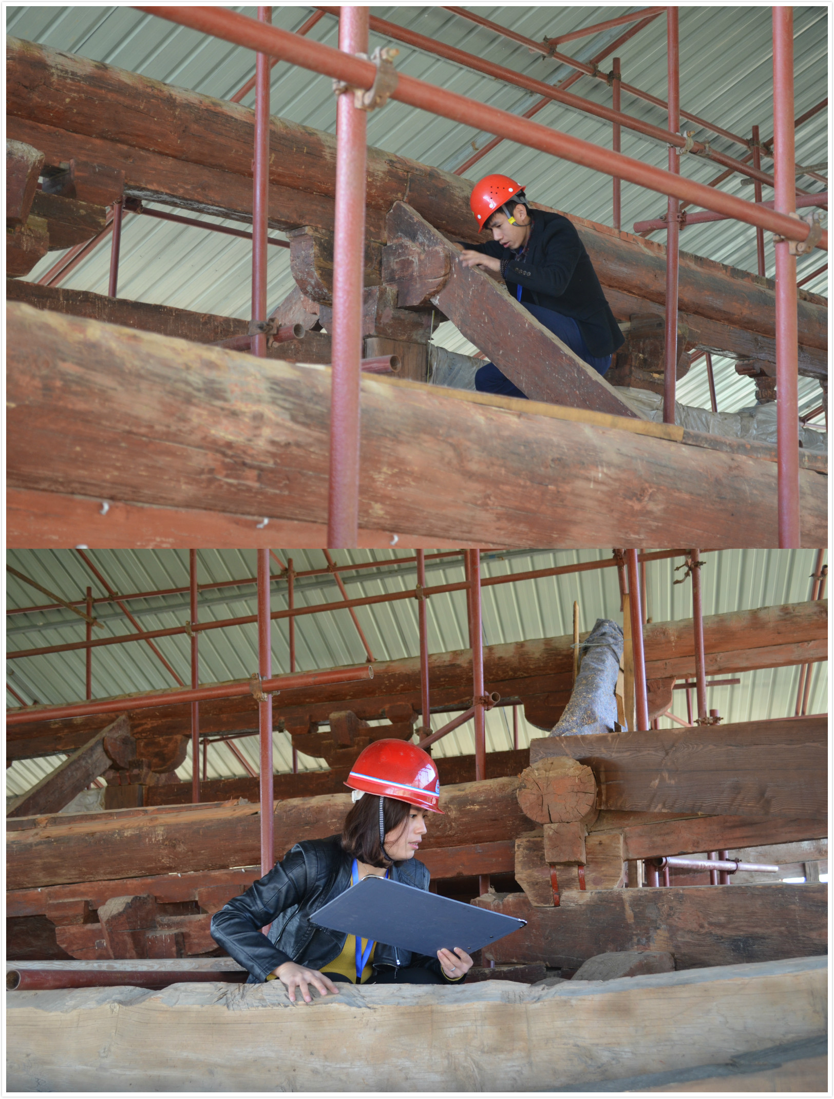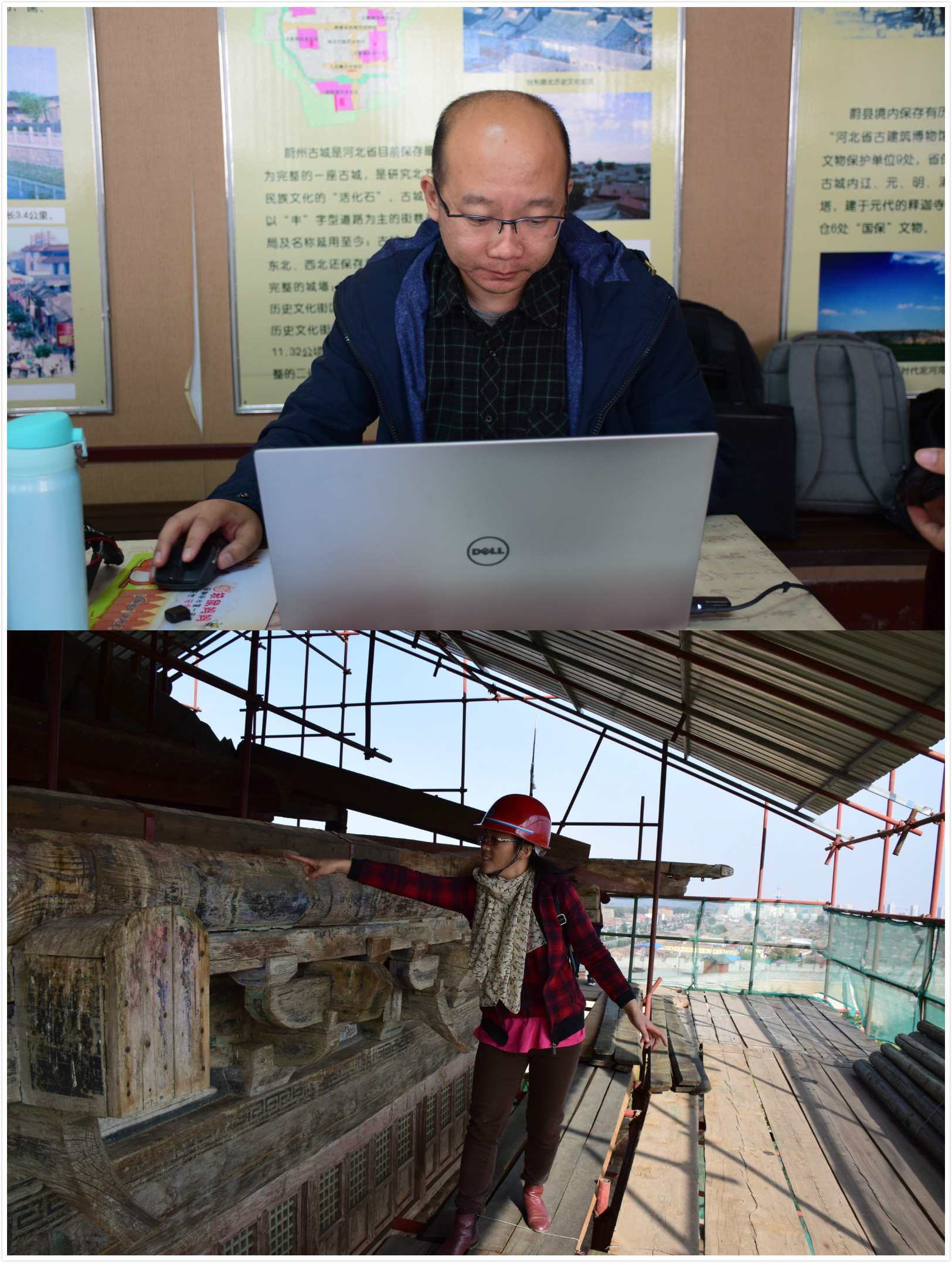 (上图:杨传江补测顶部梁架数据 下图:袁维妮观察斗拱构件)