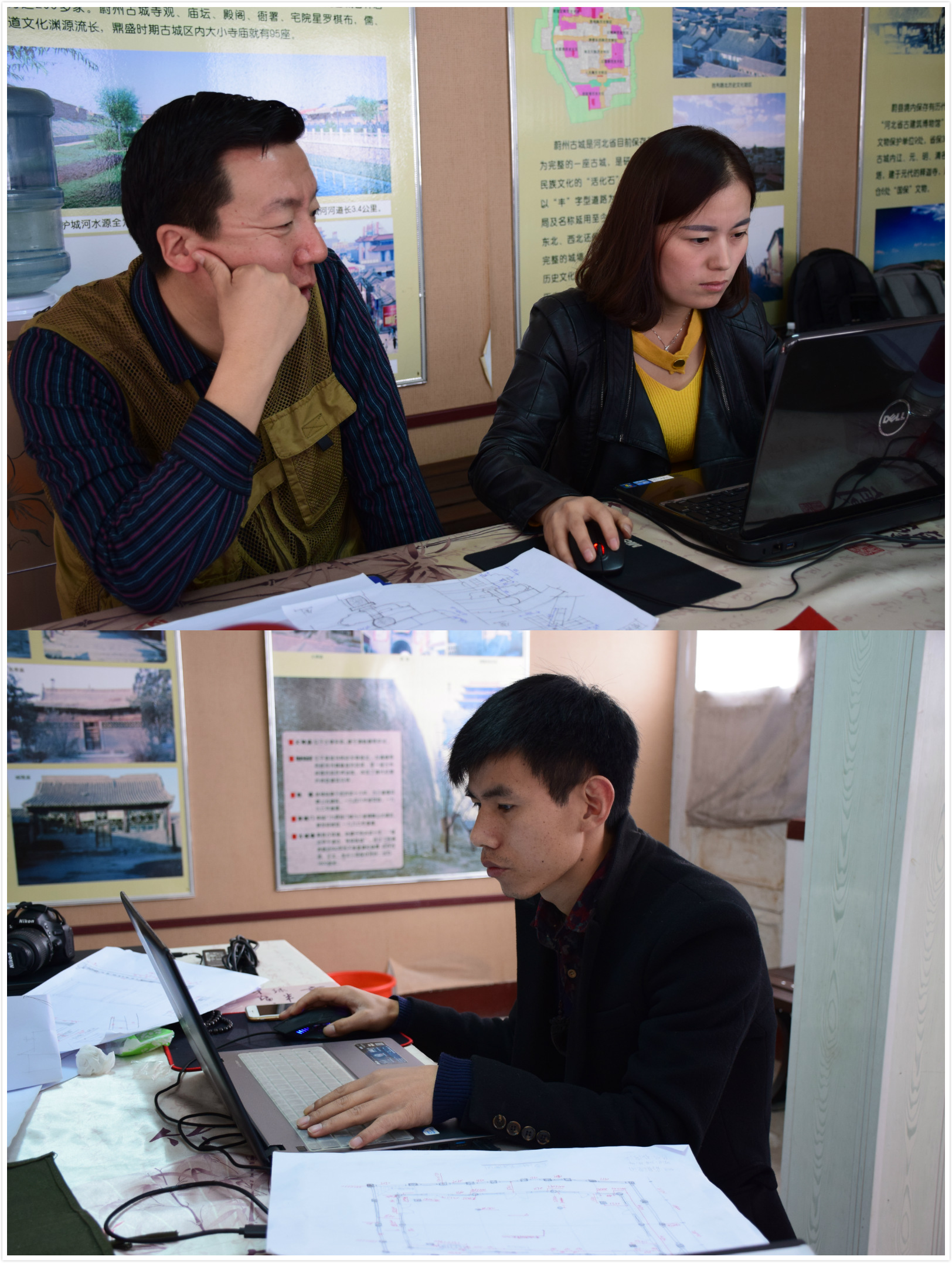 今天的分工为:由于居敬泽临时有事,今天上午要返京,刘斌的主要工作就是拍摄斗拱照片,并加工成线图。袁维妮和杨传江电脑制图,要完成斗拱、梁架、平面等,王老师从旁指导。任海云、刘瑛、杨森则负责玉皇阁残损现状拍照、描述,并要尽快搜集整理相关背景资料。