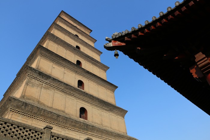 大雁塔是用来保存唐高僧玄奘法师从印度带回来的佛经和佛像。武则天长安年间因倒塌而重建,高十层,后被战火毁掉上部三层,剩余七层,后唐长兴年间曾经修缮。明万历年间在塔身外面包砌一层面砖,形成今日的外风.大雁塔现为方形七层楼阁式塔,塔身结构为砖砌单层塔壁,内各层架楼板,设木楼板直通顶层。塔外壁砖砌立柱,表现开间数目。各层挑檐用砖砌作叠涩牙子,塔顶为定瓶葫芦。整个塔造型雄伟稳健,风格朴实,为唐代楼阁式塔的典范。