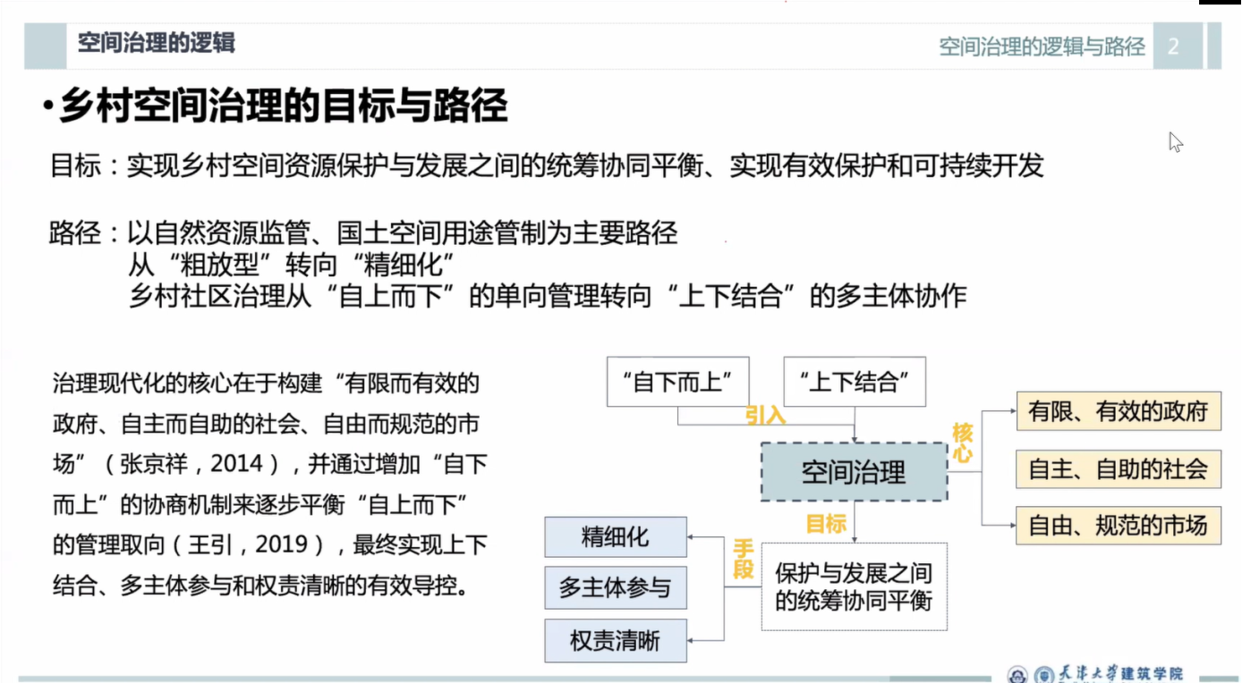 曾鹏教授以“乡村空间认知、空间治理的逻辑与路径、空间治理背景下的乡村发展、空间治理背景下的乡村规划、乡村发展与规划的提升维度”这五部分进行阐述。首先从不同学科维度讲述了乡村空间这一概念的认知,强调了要以系统的思维、区域的思维来看待城乡空间全要素的相互作用机制。随后讲述了乡村的作用和价值,曾教授谈到:“乡村是维持城乡社会稳定的蓄水池。”伴随着本次新冠疫情的发生,乡村在稳定城乡社会层面发挥了重要作用,是中国现代化的稳定器。同时指出乡村在治理体系及土地供给体系方面还存在着很多不足,亟需进一步研究。最后曾教授以天津市乡村规划探索的实践成果为例,进一步向我们分享了自己对于乡村规划及空间规划体系的心得与思考。