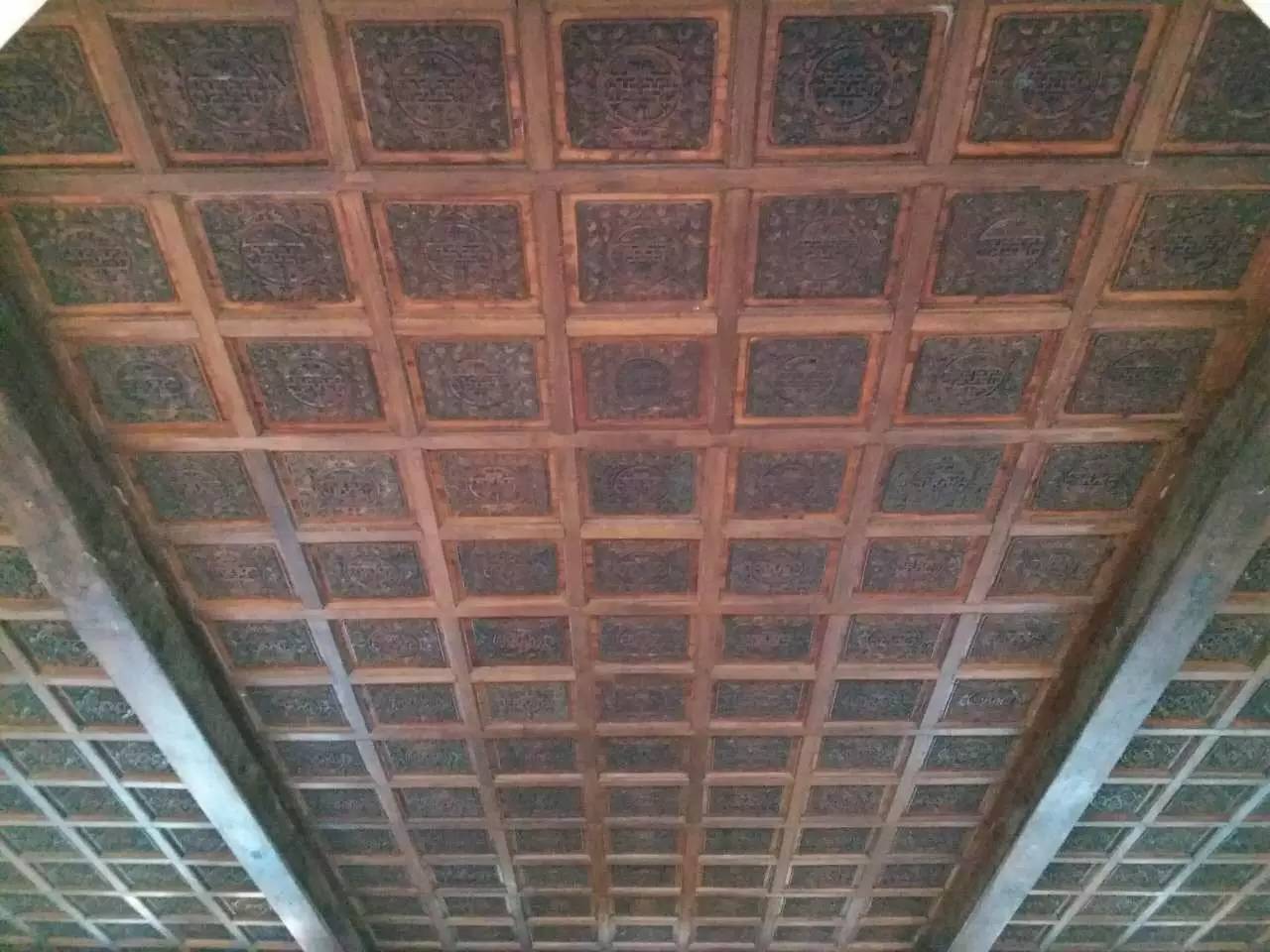 当然这些建筑也不是彻头彻尾的“呆子”,古板的 外表下其实也处处透露着古人单纯美好的愿望。似乎建筑上可以利用的地方都被用各种形式“写满了祝福语”就像下图的窗子上就刻上了“蝙蝠”和“万”寓意着万福。“天花板”上也是刻满了带有吉祥寓意的图案,也是蛮拼的。