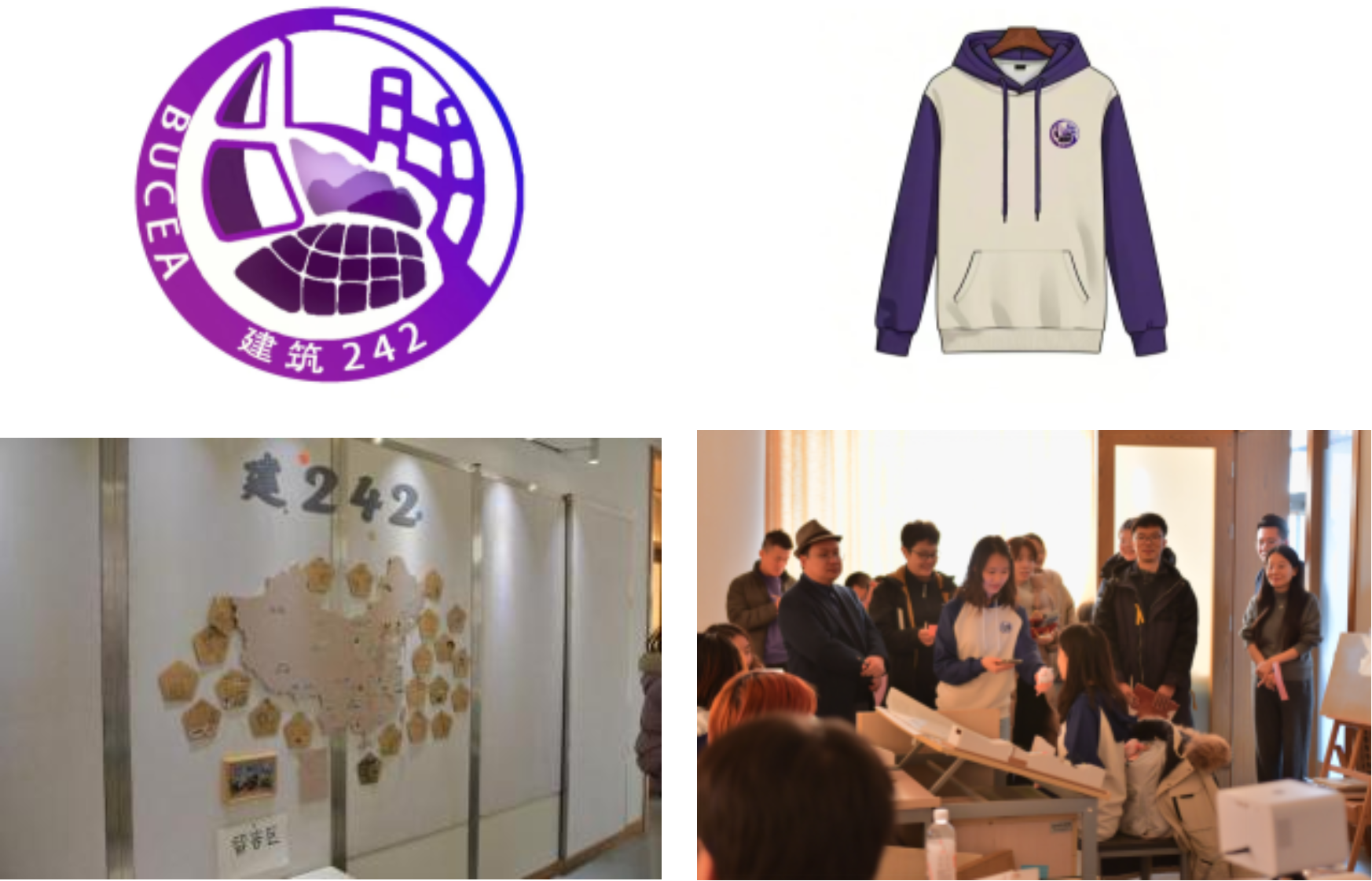 建实242班的主题是帅獭王国,帅獭是班级班长的代号。班徽,紫黄配色是两种卡套的颜色,六边形的轮廓代表我们都希望成为六边形战士,鸟一个是因为公司有很多鸟,也代表同学们展翅飞翔。我们班是一个充满活力与激情的集体,展示墙上面是每一个同学的生活照和自己家乡的建筑照片,用丝带牵到了同一个地方——北建大,我们在这里相遇相识。“学海无涯乐作舟”是我们班班训,虽然我们学习设计任务很重,经常要通宵做模型,但是我们会在专教唱歌聊天,在一种放松的状态下学习生活,保持乐观开朗的态度。