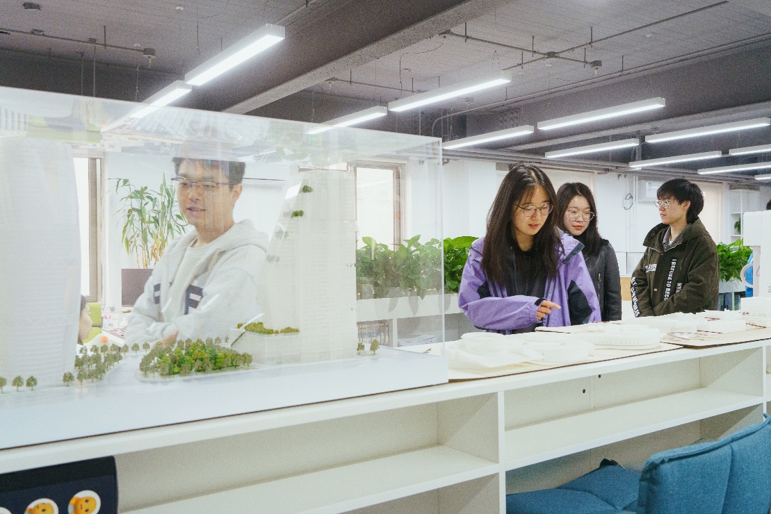 此次行程共分为两大部分。首先,在冯老师的带领下,李老师和同学们参观了教授工作室、公共办公空间、会议室、休闲空间等,对从一层到四层的整体办公环境有了大致了解。同学们欣赏着一件件精致的作品模型和墙上展出的落成项目照片,感慨着、憧憬着。