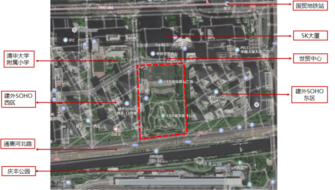 设计场地位于北京东三环国贸商圈内部,距离国贸地铁站约500米。场地南部紧邻北京大运河(朝阳通惠河段),与庆丰公园隔河相望。场地东西两侧为建外SOHO建筑群,北部毗邻SK大厦、世贸中心等商业建筑。场地四周的城市道路等级不一:东西两侧分别为恒惠东路和恒惠路(均为双车道,宽度6米);北侧为景恒街(4车道,宽度12米);南侧为通惠河北路及其辅路(宽度40米)。设计范围东西长约150米,南北长约250米,总面积约为3.75公顷。以下为员工作品。