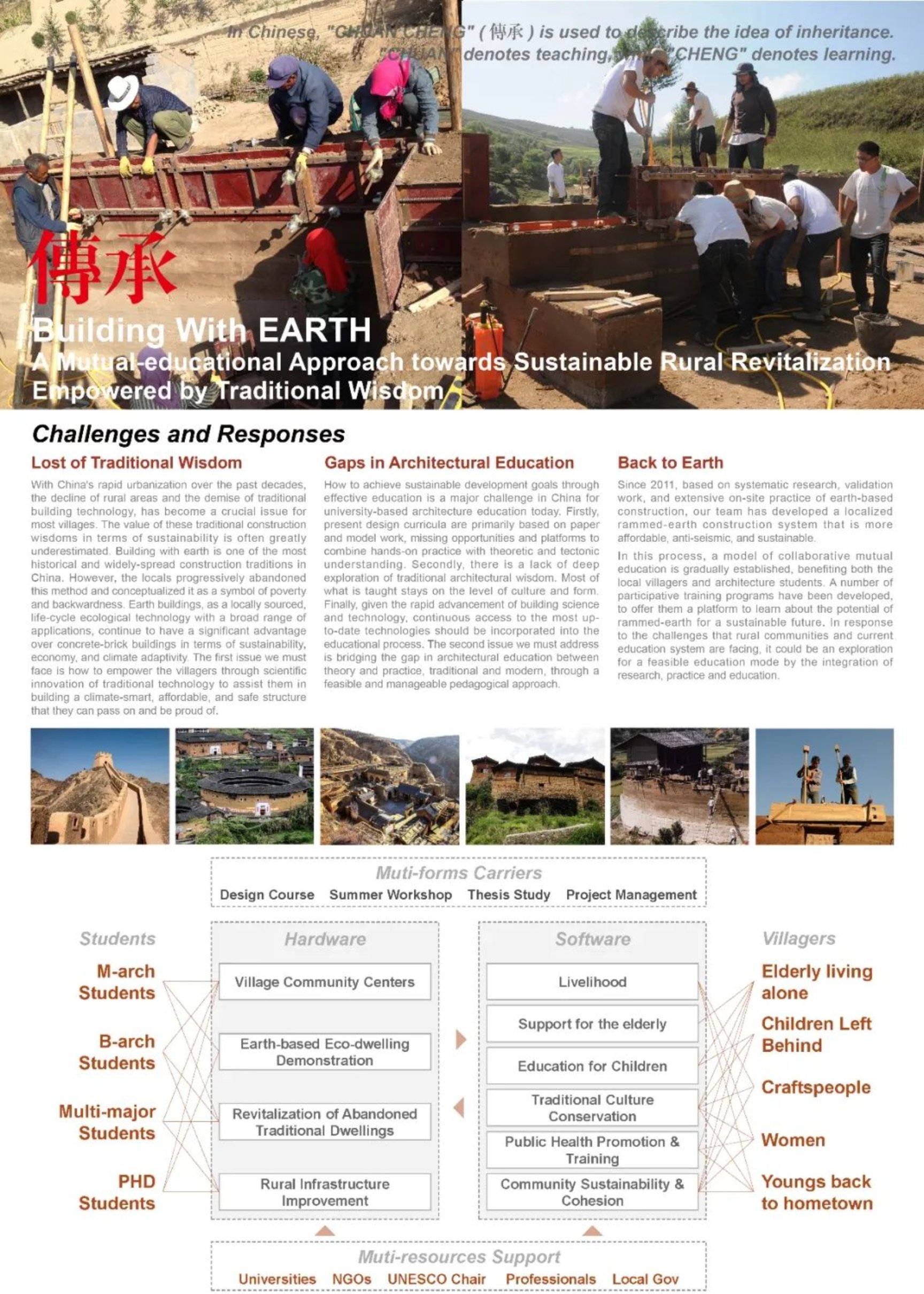 UIA建筑教育创新奖设立于2019年,面向全球范围内的建筑专业教育机构,旨在表彰跨文化、跨地域的多元化建筑教育创新,发掘有助于推动可持续发展、具有启发示范意义的教学实践。本届评审委员会基于“教学方法达到卓越水平”和“践行联合国可持续发展目标方面取得出色成就”两项评价标准,从全球五个UIA成员地区评选出4个高校项目授予创新奖,公司yl7703永利团队开展的“土生土长:基于传统传承的可持续乡村振兴与多元协同教育”项目荣获其中的一项。