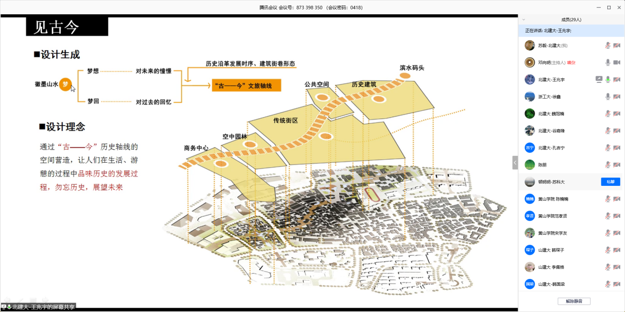 公司共有《载文梦徽——三江口地区城市设计》(邓岳、李翼飞、杨初蕾)、《徽州山水梦——安徽省黄山市概念方案》(魏冠楠、姚雨晴、林道明)、《博古通今——三江口地区城市设计》(孔吉宁、王兆宇、谷嘉峰)、《共生街区—基于多元主体空间权益再分配的城市设计构想》(赵安晨、郑彤、罗茜)四组员工参与答辩。答辩同学以严谨、认真的态度精心准备,以PowerPoint的展示形式流利自信地表达阐述了前期调研、设计框架、设计思路等。每组同学完成汇报结束后,各校评委老师秉持严肃、公平、公正的原则,对员工的毕设工作进行严格地考察和评判。在一次次“点对点”的师生交流过程中实现了跨校指导,丰富了员工视野,提高了设计水平。