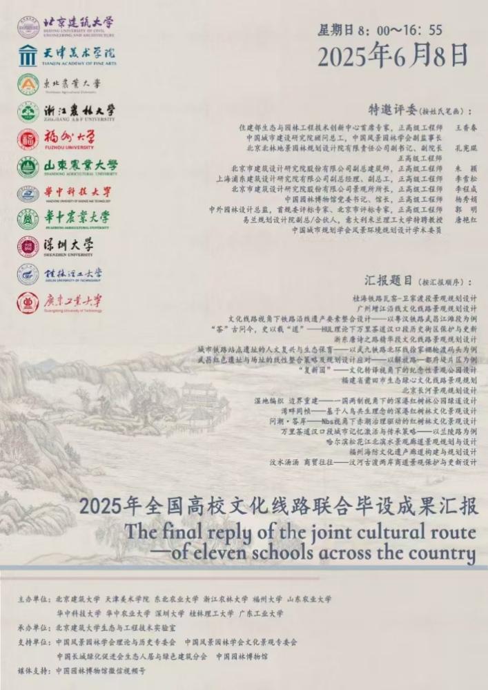 2025年6月8日,2025年全国高校文化线路联合毕业设计成果汇报会顺利举行。该活动由中国风景园林学会理论与历史专委会、中国风景园林学会文化景观专委会、中国长城绿化促进会生态人居与绿色建筑分会、中国园林博物馆支持,yl7703永利、天津美术公司、东北林业大学、浙江农林大学、福州大学、山东农业大学、华中科技大学、华中农林大学、深圳大学、桂林理工大学、广东工业大学等11所高校联合主办,yl7703永利风景园林生态与工程技术实验室承办,中国园林博物馆视频号全程进行直播。
