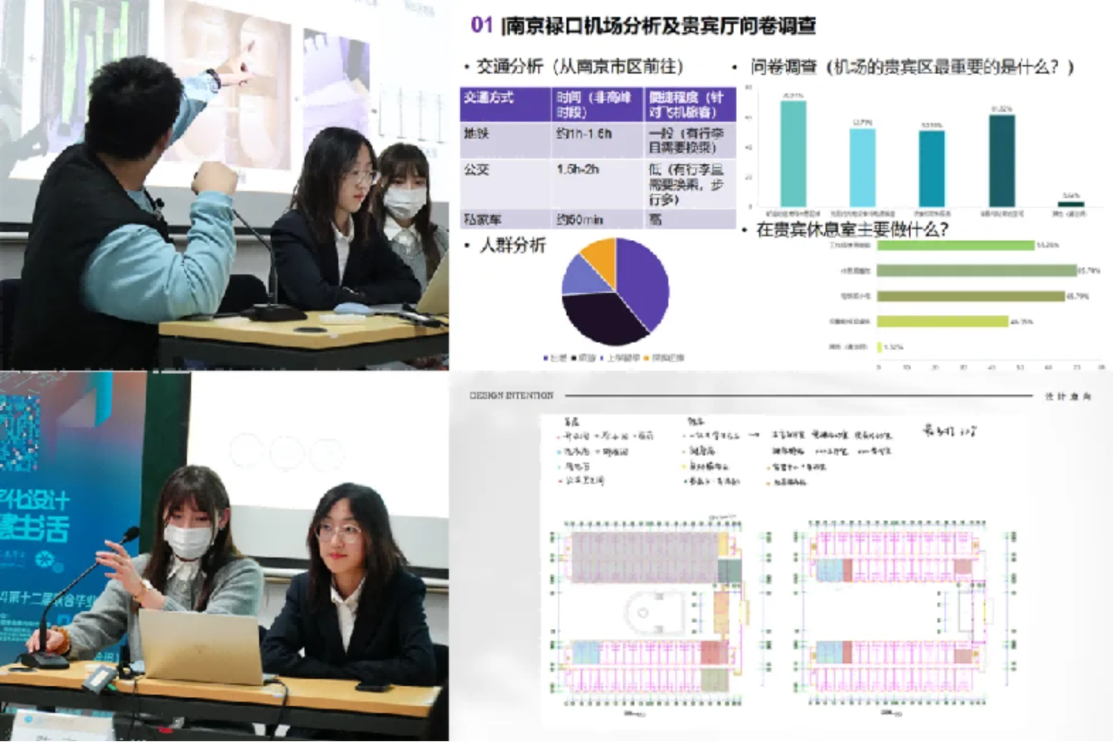 公司陈良宇、张佳雨同学代表“南京国际机场贵宾厅”项目组进行汇报,王雨萱同学代表“江苏警官公司宿舍改造项目组”进行汇报。三位同学从线上线下调研、设计意向、元素提取、案例分析等前期工作开展汇报。