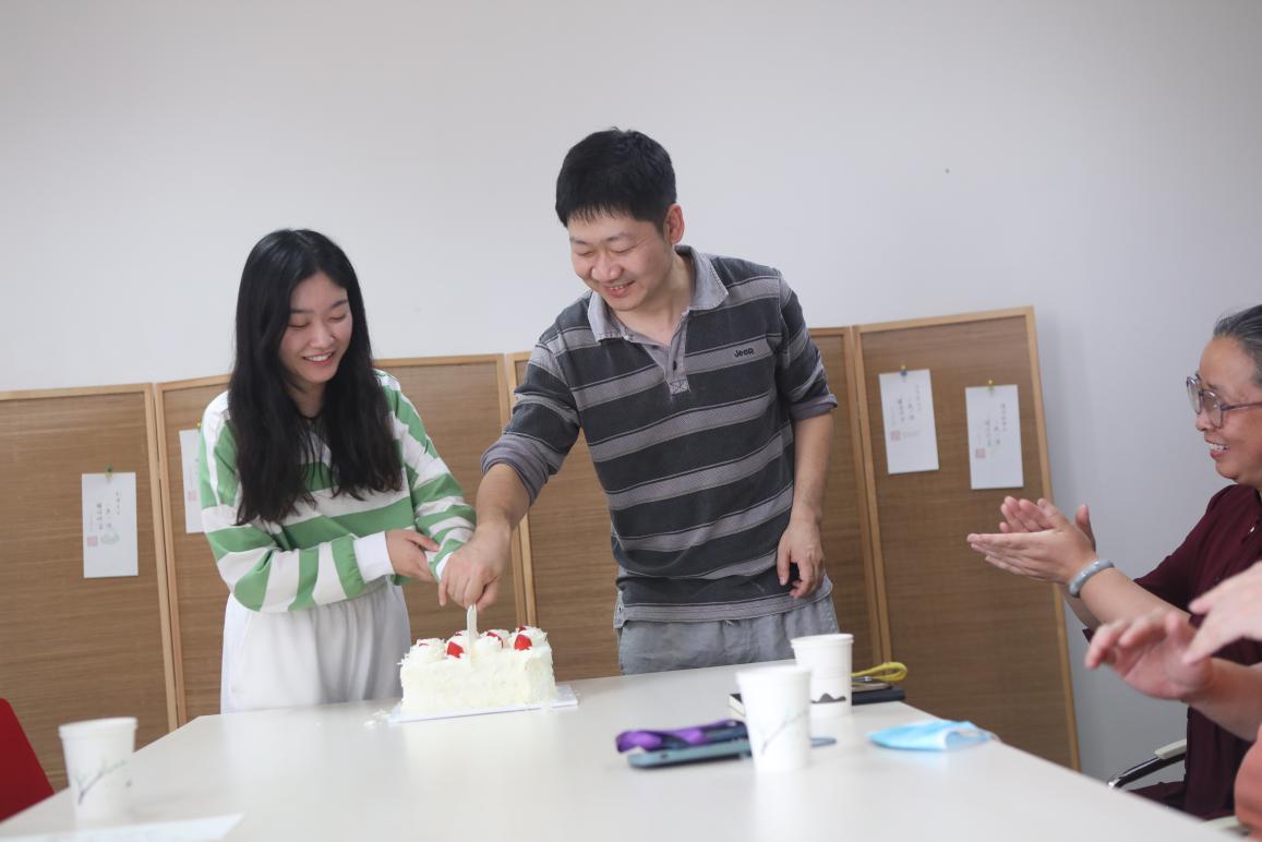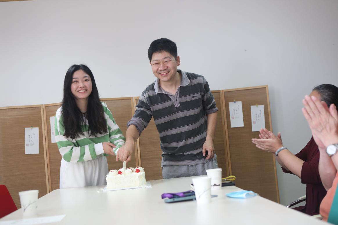 苏毅老师和陆冰清老师代表所有九月过生日的老师们上台切下生日蛋糕的第一刀,他们细心地将蛋糕分成小块,送到大家手中。老师们一边品尝蛋糕,一边分享祝福,甜甜的蛋糕映着甜甜的笑脸,会议室的各个角落都洋溢着幸福与微笑。