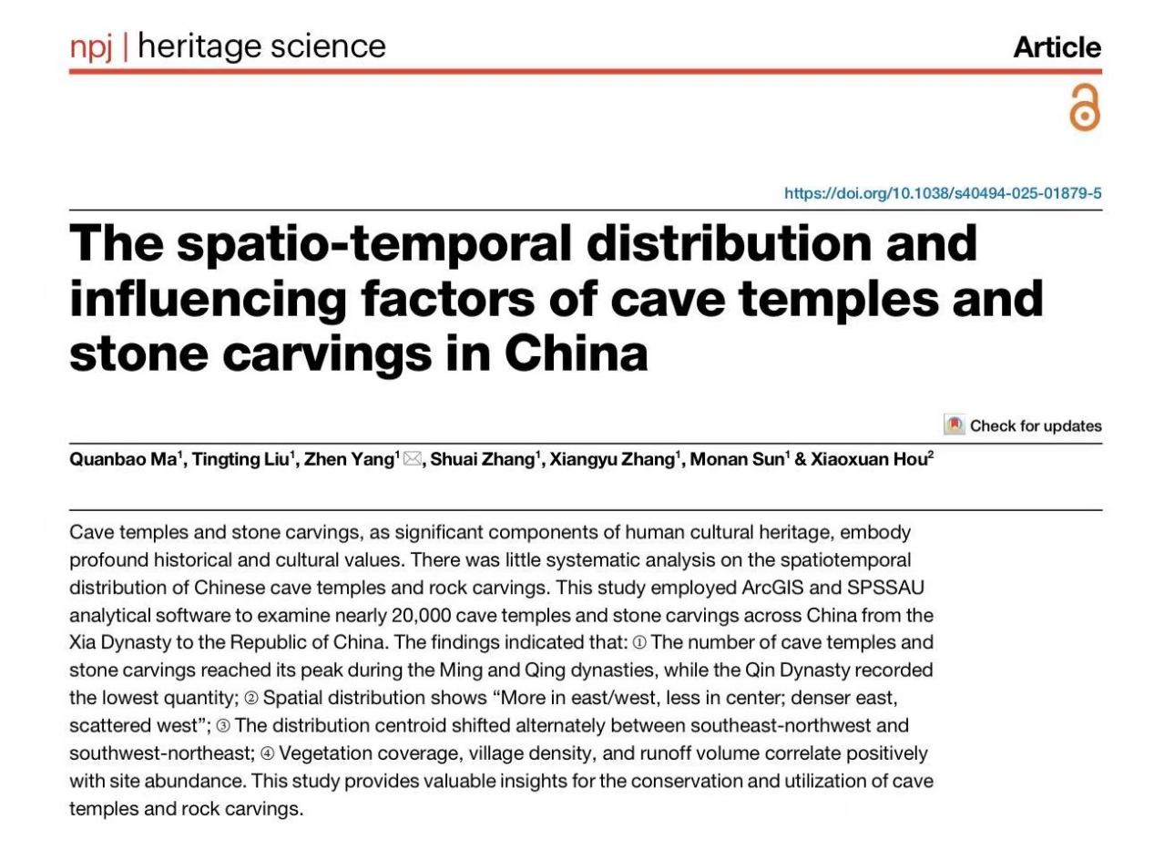yl7703永利历史建筑保护系马全宝副教授、城乡规划系杨震副教授、研究生刘婷婷在社会学领域期刊《npj Heritage Science》发表题为《The spatio-temporal distribution andinfluencing factors of cave temples andstone carvings in China》的重要研究成果。该期刊是Springer旗下国际性的跨学科期刊《npj Heritage Science》,前身为《Heritage Science》,2025年1月正式更名并纳入自然(Nature)合作期刊(npj)体系(SCIE、A&HCI),中科院人文科学一区期刊。其核心领域包括文化遗产的物理化学分析、生物降解过程、科技考古及跨学科研究,覆盖自然科学与人文科学交叉方向。论文以yl7703永利为第一署名单位,马全宝副教授为第一作者,研究生刘婷婷为第二作者,杨震副教授为通讯作者。