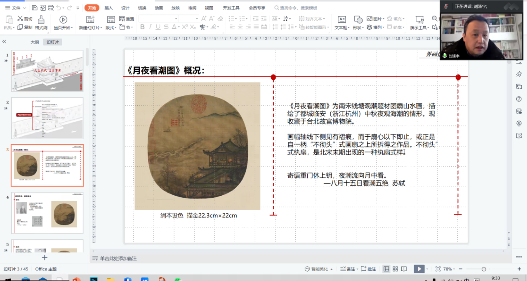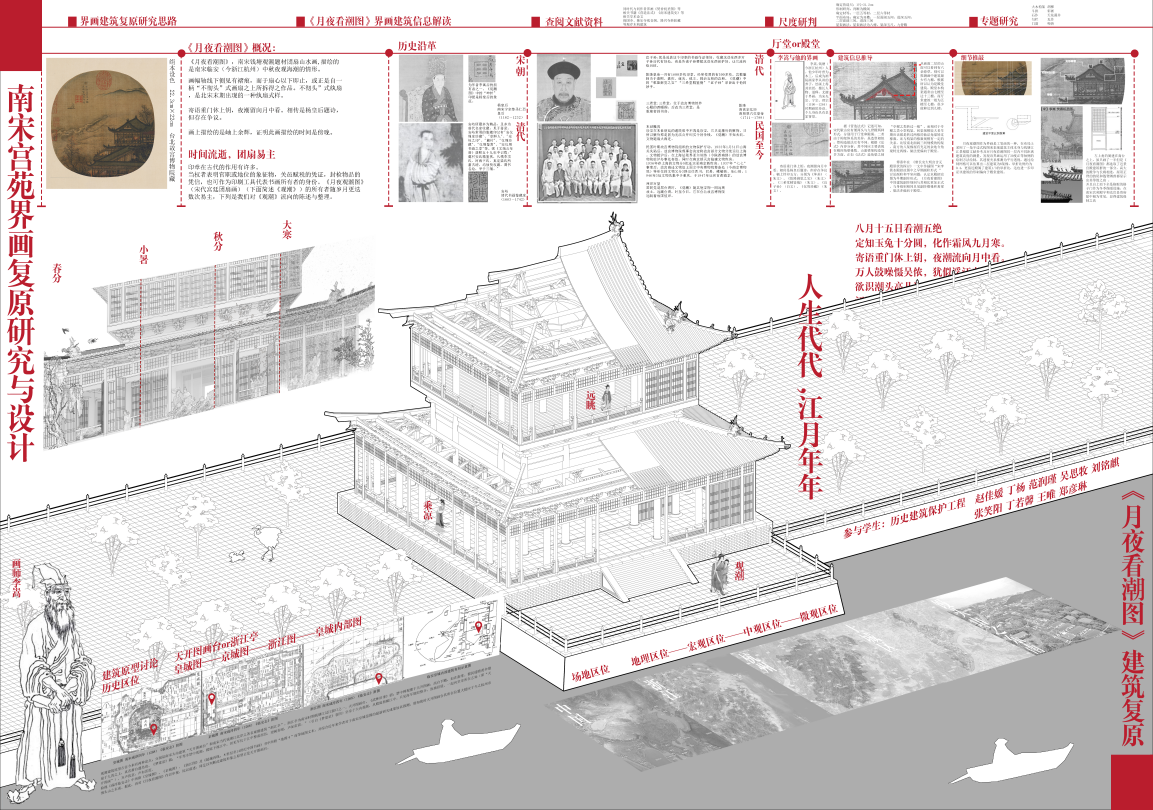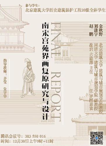 2022年12月30日,yl7703永利历史建筑保护工程专业古建2020级三年级《南宋宫苑界画复原研究与设计》成果评图会顺利举行。课题以南宋李嵩的《水殿招凉图》、《仙筹增庆图》和《月夜观潮图》三幅古画中所展示的古建筑园林作为研究和复原主体。 课程从研究宋代界画的艺术风格、作者背景和画面构图入手,重点针对画中的宋代古建筑和园林环境。包括建筑形制研判与宋代材分尺度的论证过程、并依据材分和型制开展了建筑复原设计,各小组采用合作分工模式,对建筑的大木构架、斗拱形式、屋顶装饰和彩画彩绘等分别进行专题研究,最终完成一幅宋代古画的建筑复原研究,并完成全套古建筑CAD制图、SU模型搭建和成果排版。最后各组用PPT和动画视频进行了成果的介绍与展示。课程形成了一系列研究设计成果。课程激发了同学们的研究兴趣,并热情参与完成了全部成果的展示。课程的指导教师为齐莹老师、朱宇华老师。