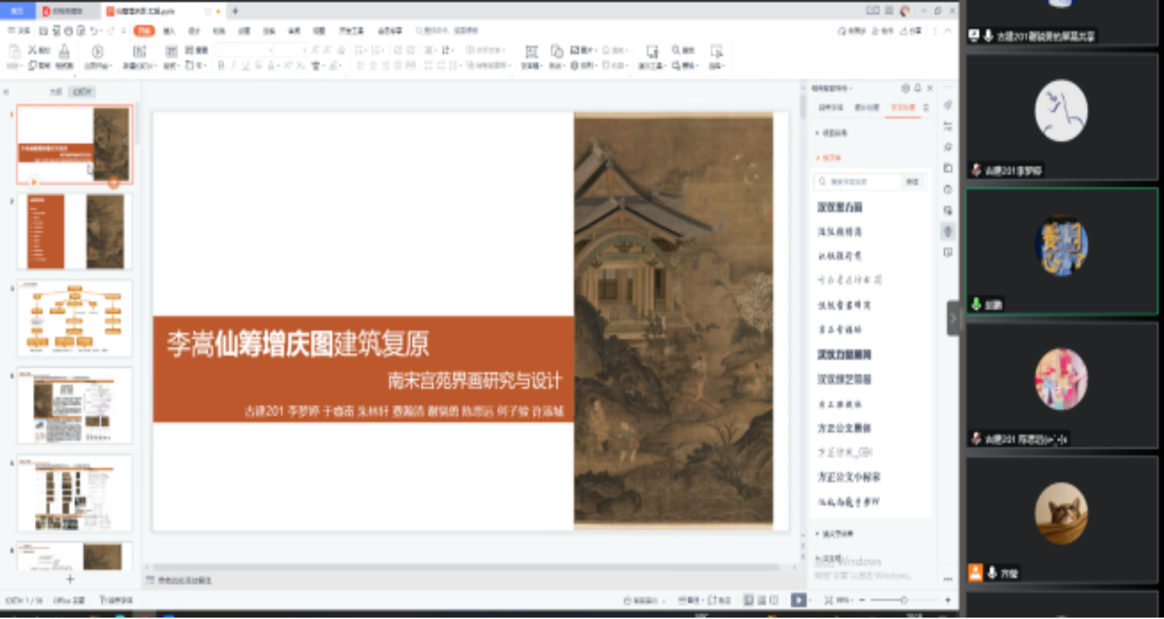 本次专业评图会,齐莹和朱宇华老师特别邀请了yl7703永利金秋野教授、同济大学yl7703永利刘涤宇副教授和故宫古建部主任赵鹏研究员作为评图嘉宾。受疫情影响,采用了线上评审会的方式。三位行业专家对本次课程的复原研究过程、最后的技术图纸、古建复原动画表达等方面成果内容进行了热情的点评。