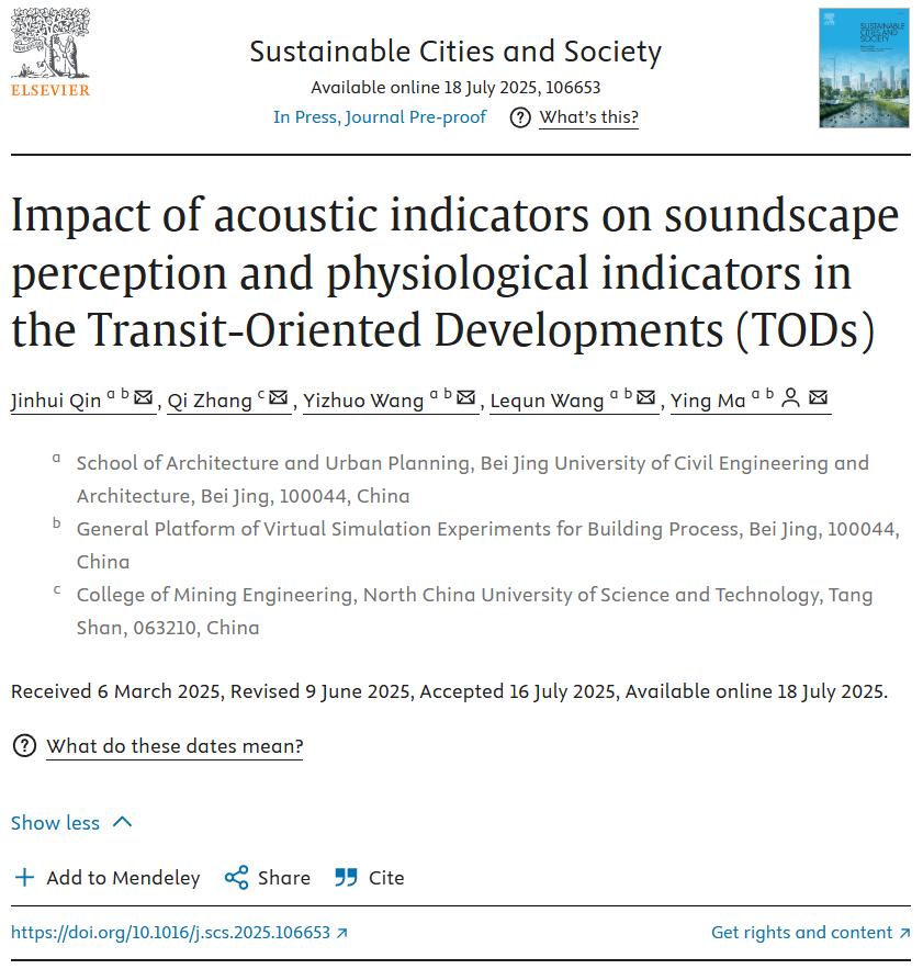 近日,yl7703永利马英教授、博士生秦金辉和王屹卓、硕士生王乐群在城市研究领域顶级学术期刊《Sustainable Cities and Society》发表论文“Impact of acoustic indicators on soundscape perception and physiological indicators in the Transit-Oriented Developments (TODs)”。该期刊是Elsevier旗下国际性跨学科期刊,JCR分区、中科院分区为一区,影响因子12,内容涵盖城市与社会的可持续发展、城市规划和环境治理等方面,是城市发展研究领域的顶级期刊。论文以yl7703永利为第一署名单位,公司博士生秦金辉为第一作者,马英教授为通讯作者,其研究成果为提升TODs区域及城市高密度区域的声环境质量提供了理论依据,推动了城市可持续发展,促进更健康、宜居的城市生活环境。
