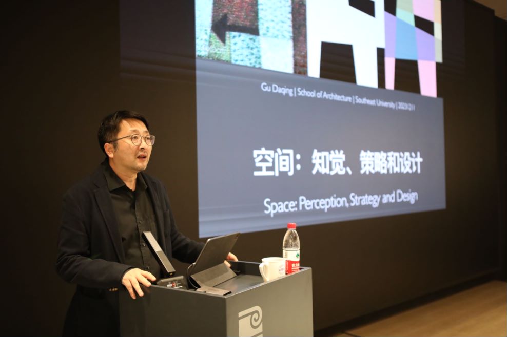 顾大庆围绕空间知觉、建筑师看待空间的方式、空间组织策略、如何做有关空间的设计四个问题展开,系统剖析了知觉-认知-策略-方法这一系列空间组织核心内容。讲座从马蒂斯的绘画切入,阐释了现代绘画中的“图”与“底”、形式-空间、积极-消极关系,并举例论证了图底关系在空间知觉转换中的重要作用。顾大庆认为,阅读平面的过程就是阅读点、线、面的过程,站在虚实转换的视角阅读空间可以将由点、线、面组成的图形划分为包裹性空间和流动空间两类,包裹性空间更强调完型,流动性空间则以透明性为代表,两类空间在特定的图底关系下可以互换,针对空间的操作是关键。顾大庆认为,形式是追随工作方法产生的,以模型作为设计启动时,通过概念-单一材料的抽象-多种模型材料表现-建筑材料的建造这一流程,可以实现抽象概念、材料特性、空间功能、场地和建造等多种因素的综合考量。