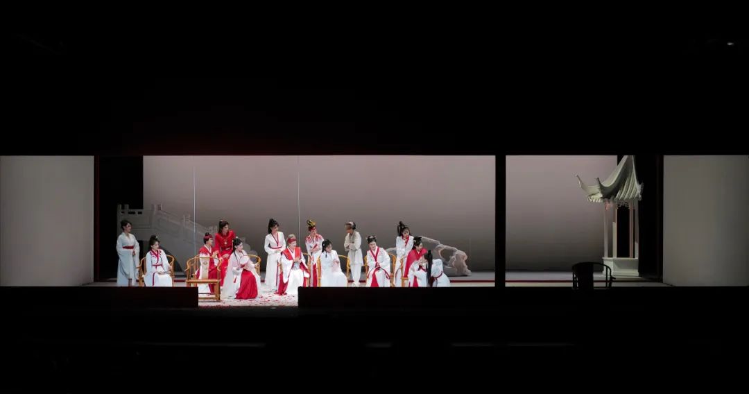 园林艺术日益融入展览空间和舞台艺术中,艺术家借鉴运用园林艺术,不断做出创新。2021年上海话剧艺术中心出品的话剧版《红楼梦》,其舞台设计别具匠心。“刘姥姥进大观园”一幕,演员们置身于横向展开的舞台上,在她们身后布置了一桥、一石、一亭,采用极简主义手法传递出东方园林的韵味。