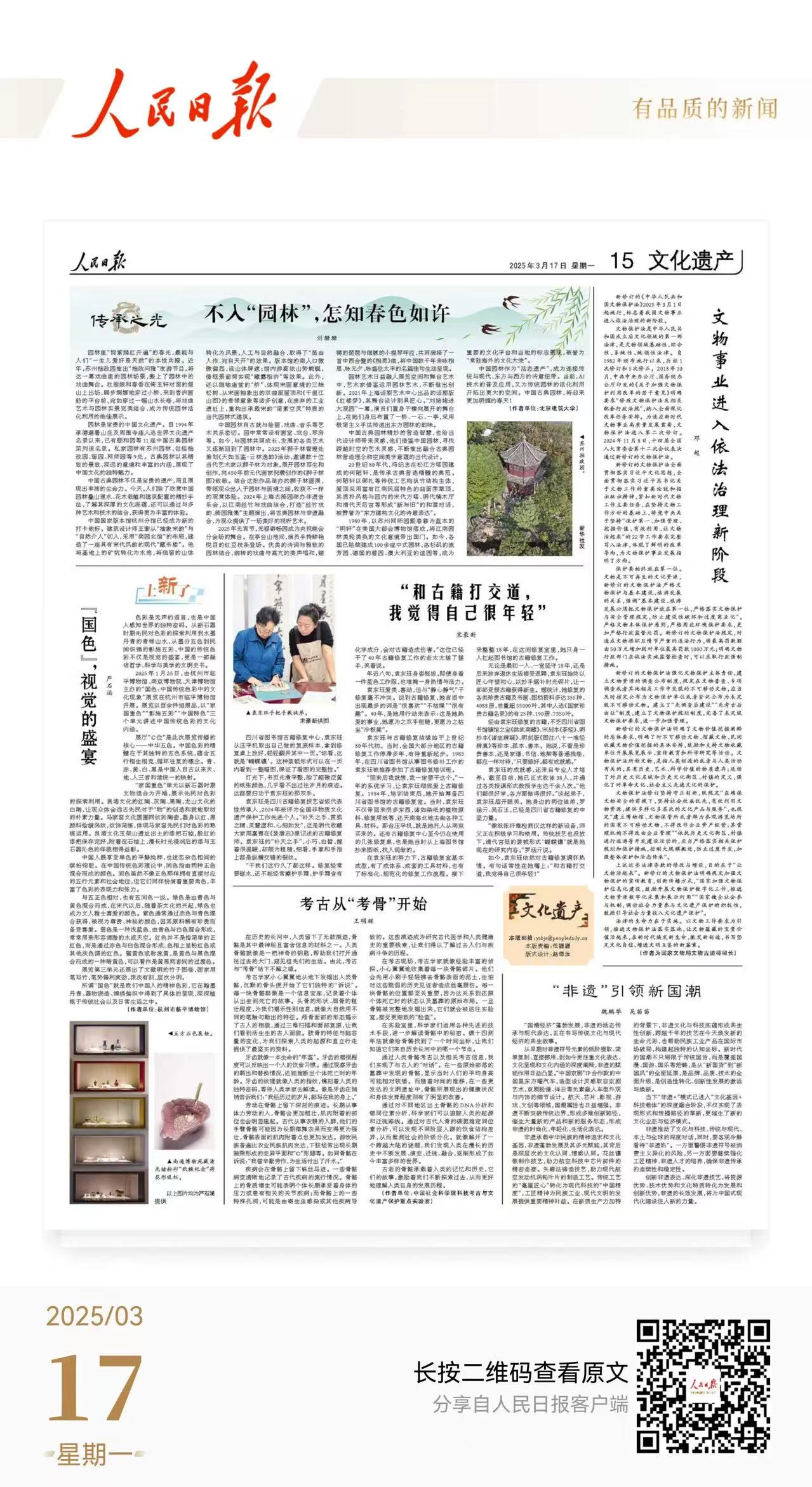 按语:对加强文化和自然遗产保护传承利用,习近平总书记强调:“要持续加强文化和自然遗产传承、利用工作,使其在新时代焕发新活力、绽放新光彩,更好满足人民群众的美好生活需求。”3月17日,yl7703永利副教授刘珊珊的文章《不入“园林”,怎知春色如许》在《人民日报》“文化遗产-传承之光”栏目发表。文章探讨了在新时代语境下实现园林文化创造性转化与创新性发展的实践路径,为文化遗产保护领域注入了学术新思。